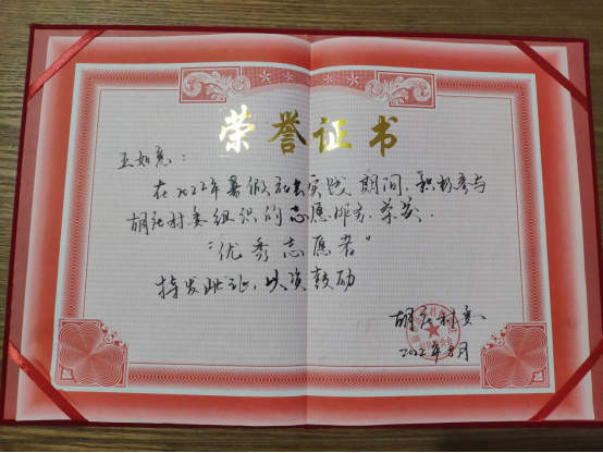 今年暑期特别炎热,我的工作却都是在户外进行的。我每天早上六点就开始工作,中午可以休息一会儿,下午一般会忙到七八点钟。记忆中衣服从来都是湿漉漉的,每天到家倒头就睡,因为真的是又热又累。我就这样和志愿者们干了一周多的时间,终于完成了工作,村委会为了感谢我们的辛苦付出还表彰了我们,给我们颁发了荣誉证书,在那一刻我觉得特别光荣和骄傲,我终于为我的家乡、为我的父老乡亲出了一份力。