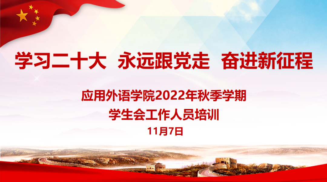 为建立学生会组织全体工作人员培训制度,加强共青团对学生会指导管理的责任,全面落实从严治会要求,11月7日中午,应用外语学院开展了2022年秋季学生工作培训会,会议由我院党总支副书记田莉莉主持,全体学生会成员共同参与了本次培训。
