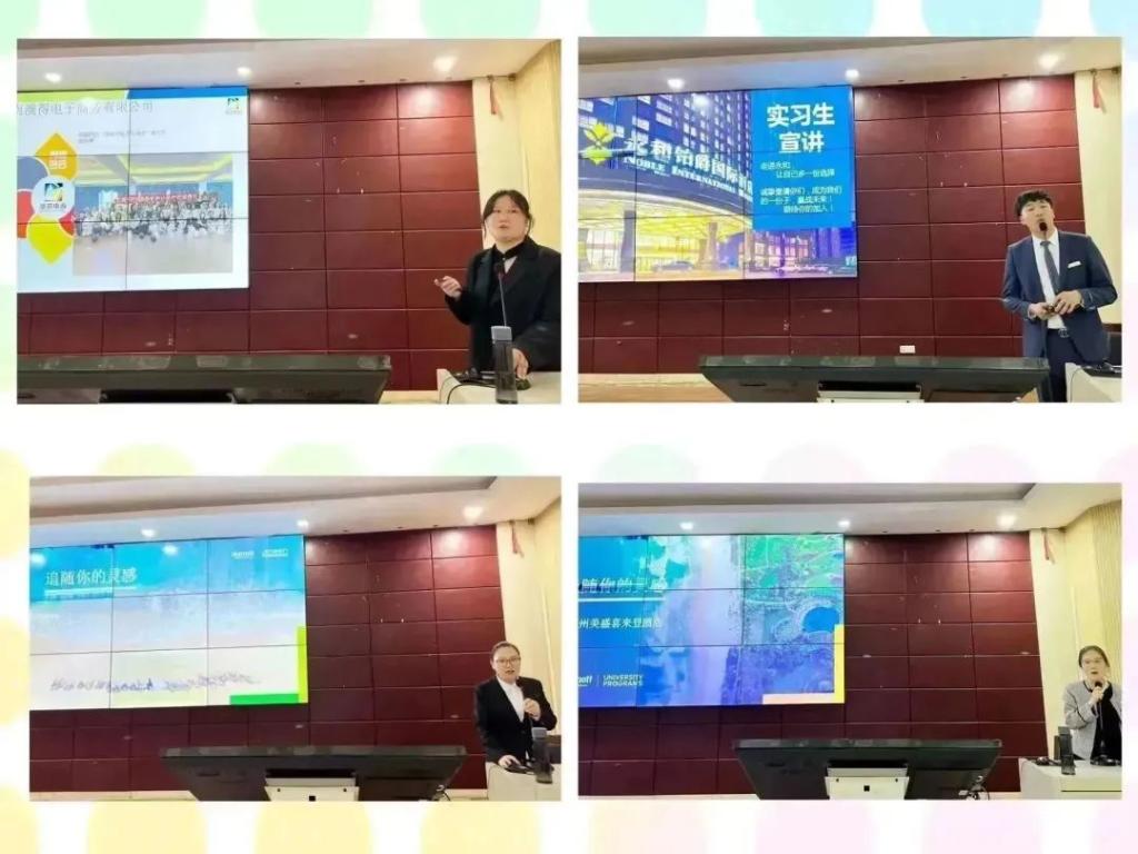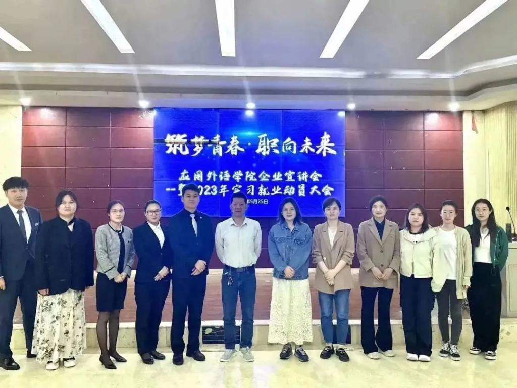 为深入贯彻党的二十大精神,落实党中央、国务院关于促进高校毕业生等青年就业决策部署和学校毕业生实习就业工作会议有关要求,进一步做实做细应用外语学院毕业生就业工作,2023年5月25日晚上6点,应用外语学院在龙湖校区3201教室召开企业宣讲会暨2023年实习就业动员大会。应用外语学院党总支书记李松奇、副院长顾佳、党总支副书记田莉莉等领导出席了本次会议。参与本场宣讲会的优秀企业有河南澳得电子商务、郑州喜来登酒店、永和铂爵酒店以及郑州航空港万怡酒店。