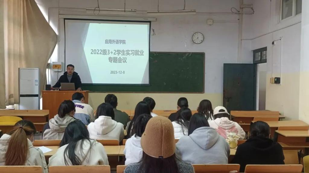 为贯彻落实学院高质量就业要求,引导学生明确实习目标及就业方向,做好实习准备,树立正确的实习观,提高就业能力,12月8日下午,应用外语学院在龙湖校区1306教室召开了2022级3+2学生实习就业专题会议。党总支副书记赵伟生、副院长顾佳、辅导员、实习指导老师以及2022级3+2学生参加了本次会议,会议由顾佳主持。