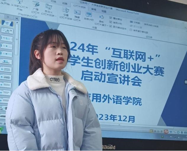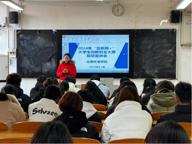 为进一步提升应用外语学院双创工作的水平,激发大学生的创新创业意识,培养具备综合素质、创新精神和创业能力的人才,12月20日,应用外语学院于2208教室举办了2024年“互联网+”大学生创新创业大赛启动宣讲会,我院党总支副书记赵伟生、辅导员们及80余名学生参加了会议。