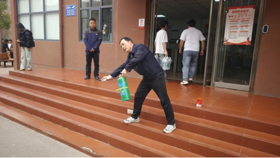 消防疏散演练开始时,学校安全保卫处刘国庆老师首先示范了灭火器的正确使用步骤。他一边详细讲解操作要点,一边进行实际操作演示,并邀请部分学生亲自体验,成功扑灭模拟火源。这种亲身示范的方式,让同学们更加深入地掌握了消防器材的使用方法。