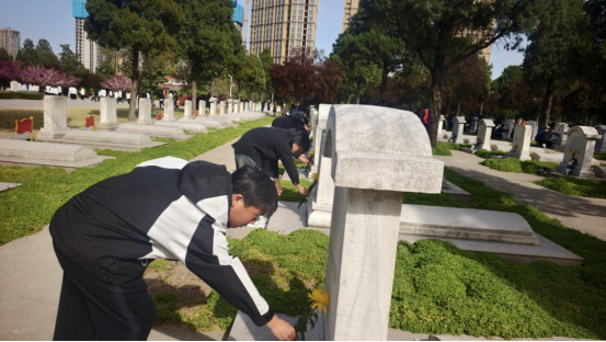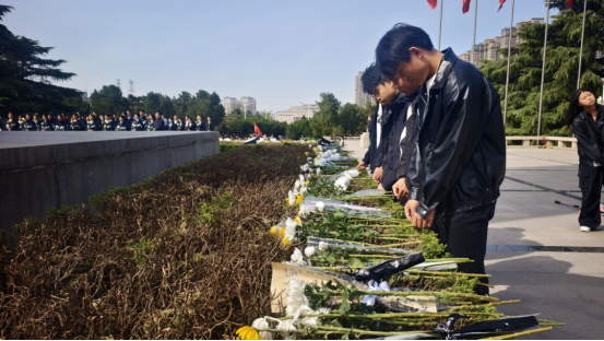 在烈士陵园内,同学们整齐排列,在庄严肃穆的气氛中向烈士公墓行鞠躬礼并敬献花束,大家集体默哀,深切缅怀为党和国家事业牺牲的先烈们。