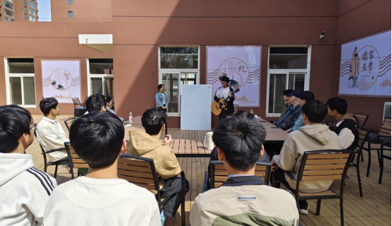 活动在音乐学院聂子昂同学悠扬的吉他弹唱中拉开帷幕。一曲原创英文歌曲《TIME MACHINE》以其清新旋律瞬间点燃全场热情,同学们随着节奏迅速进入英语学习氛围。