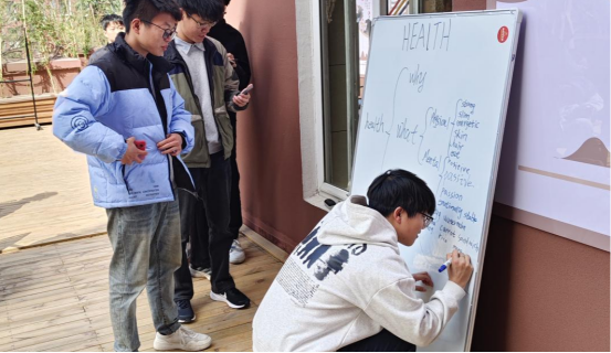 主持人24应英1班胡晓丹同学以别开生面的方式开启主题探讨。她通过现场白板展示"健康"思维导图框架,将话题巧妙分为“Why-What-How”三大板块。“健康不仅是身体的强壮,更是心灵的平衡,”胡晓丹用流利的英语阐释道,“就像灯塔需要稳固的基座和明亮的光源。”在场同学踊跃上前,用彩色马克笔在白板上添加自己的见解。短短十分钟,白板便布满“balanced diet”、“mental relaxation”、“regular exercise”等中英文表达,宛如一幅斑斓的知识地图。
