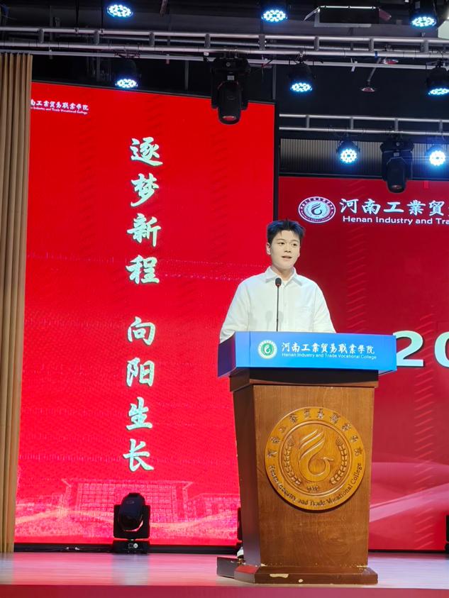 老生代表2024级旅游102班许申博分享了自己的成长体会。他通过参与酒店实习和技能大赛,在实践中提升了专业能力,并鼓励新生:“要敢于尝试,学院为我们提供了丰富的实践和升学平台,只要明确目标并坚持努力,定能收获成长。”