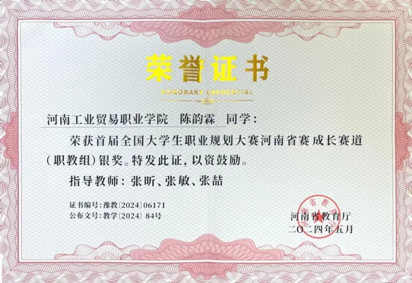在职业规划与学术探索领域,陈韵霖同样成绩斐然。2024年,她在首届全国大学生职业规划大赛成长赛道(职教组)省赛中荣获银奖;2025年,她不仅在第二届全国大学生职业规划大赛就业赛道(职教组)省赛斩获金奖,更在“挑战杯”大学生课外学术科技竞赛中,凭借两项作品分别荣获省级一等奖与二等奖。