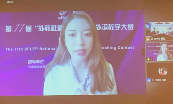受疫情影响, 11 届“外教社杯”全国高校外语教学大赛河南赛区决赛2020年1115通过线上方式(腾讯会议)举行。大赛由教育部职业院校外语类教学指导委员会上海外语教育出版社等单位联合主办本届为职业院校组课比赛我系青年教师李成作为优秀教师代表参加了比赛。李成在美留学多年,不仅深谙学术,取得了旧金山大学的TESOL硕士学位,而且钻研教学,深知中外教学之差异。赛场上,她扎实的专业素养、创新的教学方法、出色的口语能力、亲和的个人形象得到专家和评委们的一致认可,最终获得河南赛区二等奖的好成绩。