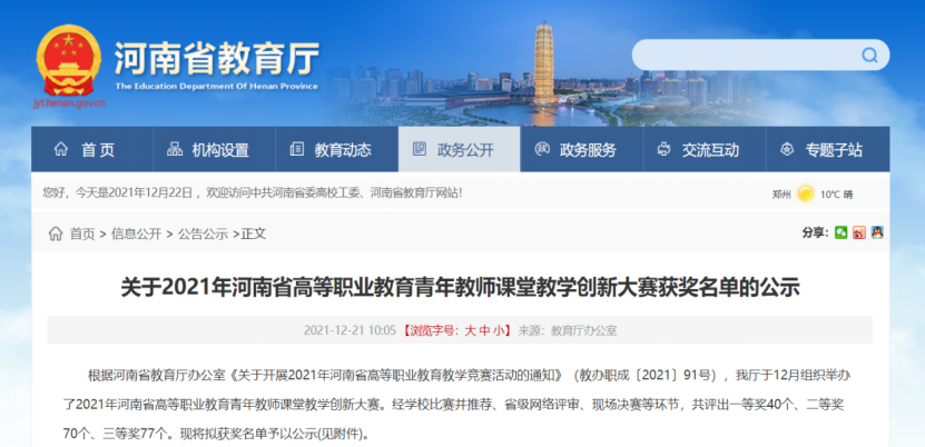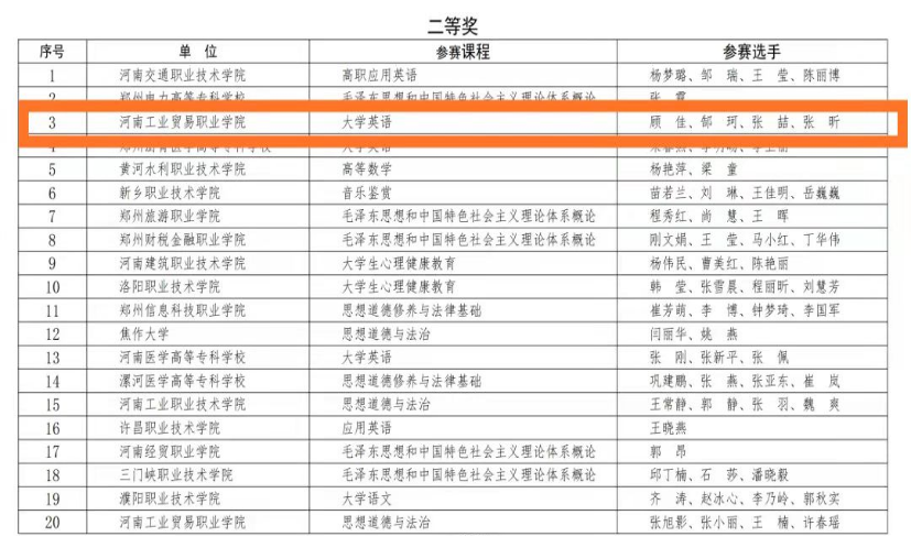 2021年12月14日-15日,由河南省教育厅主办、商丘职业技术学院承办的的2021年河南省高等职业教育青年教师课堂教学创新大赛在商丘职业技术学院成功举办,我院顾佳、郜珂、张喆、张昕四位教师组成的教学团队荣获公共基础课程组二等奖的好成绩。