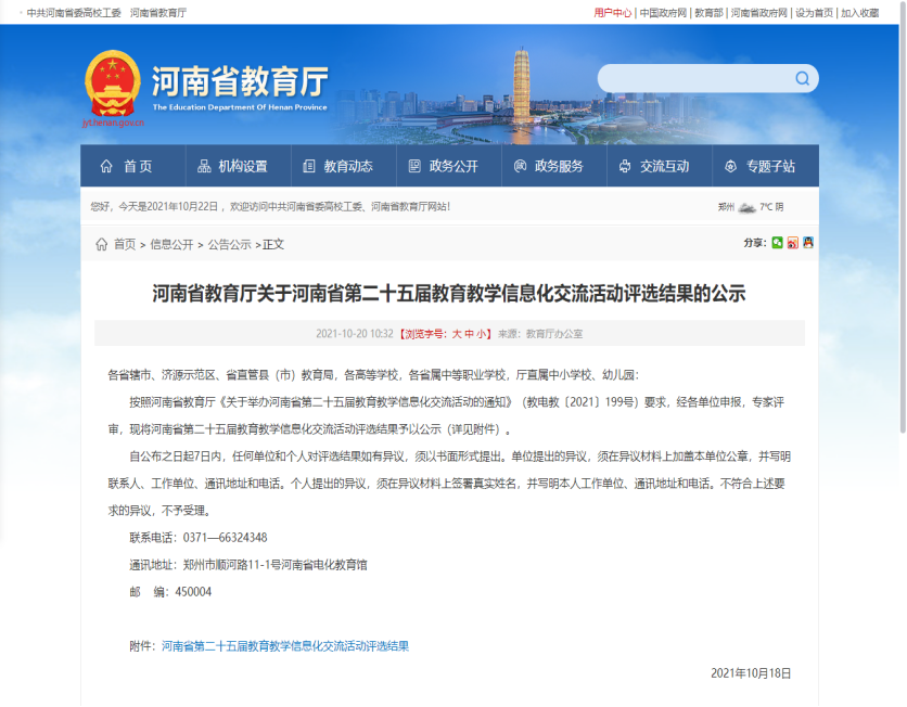 根据河南省教育厅《关于举办河南省第二十五届教育教学信息化交流活动的通知》(教电教〔2021〕199号)精神,省教育厅、省电化教育馆组织开展了第二十五届教育教学信息化交流活动作品评选工作。经各单位申报,专家评审等环节,评选出全省职业教育组——课件类205项(其中一等奖37项,二等奖78项,三等奖90项)。其中,应用外语学院赵雯老师的优质作品受到表彰。
