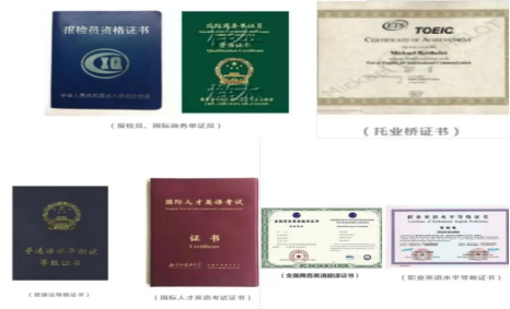 学生在校学习期间,可以考取实用英语交际职业技能等级证书(VETS)、跨境电商B2B数据运营职业技能等级证书、国际商务跟单员证、报关员证、报检员证等职业技能等级证书。我院是“实用英语交际职业技能等级证书”在河南省落地后的首批试点和考点,该证书是英语学科当中第一个也是唯一一个被列入教育部“1+X”证书目录的技能等级证书。