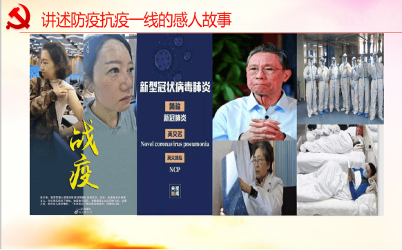 范勇慧从解读党中央关于疫情防控的决策部署、分析中国抗疫彰显的中国共产党领导优势、讲述防疫抗疫一线的感人故事、致敬我们伟大的祖国这四个方面分析了中国共产党领导下社会主义的制度优势。让学生们看到了祖国的强大、中国人民的团结、惊人的中国速度以及伟大的“逆行者”。