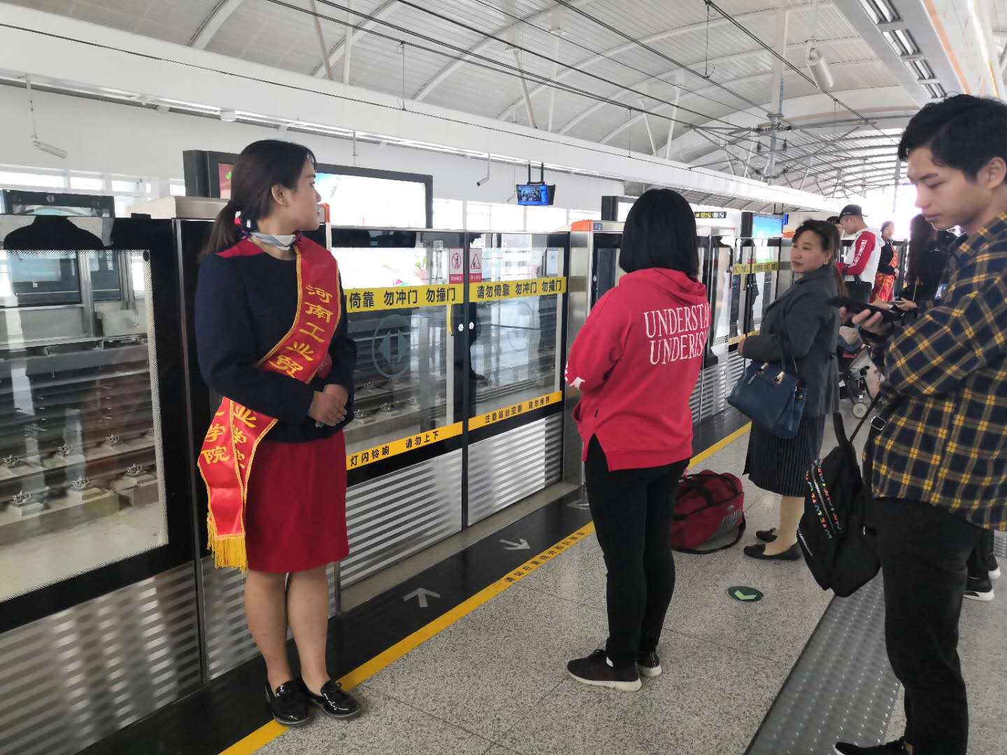 随着地铁使用频率的日益增加,为进一步倡导低碳出行的理念,推广文明乘车行为以及增强乘客排队候车意识,2018年10月11日上午9点30分,应用外语系志愿者联合郑州升达经贸管理学院和河南机电职业学院共同发起了地铁站志愿者服务活动。