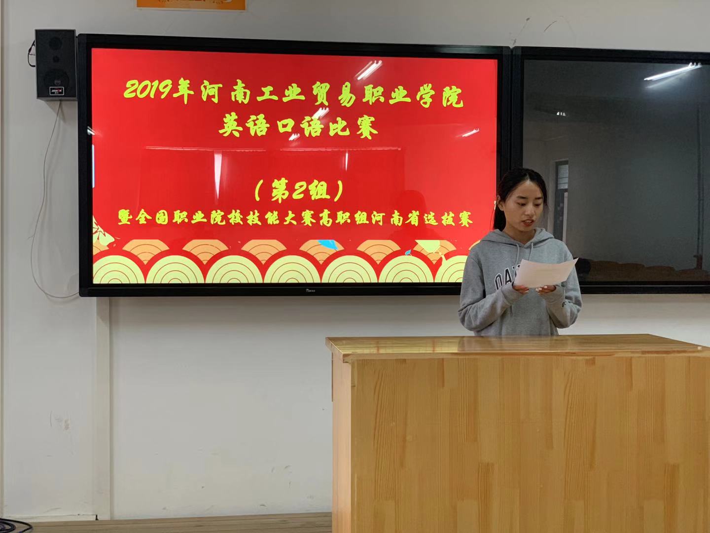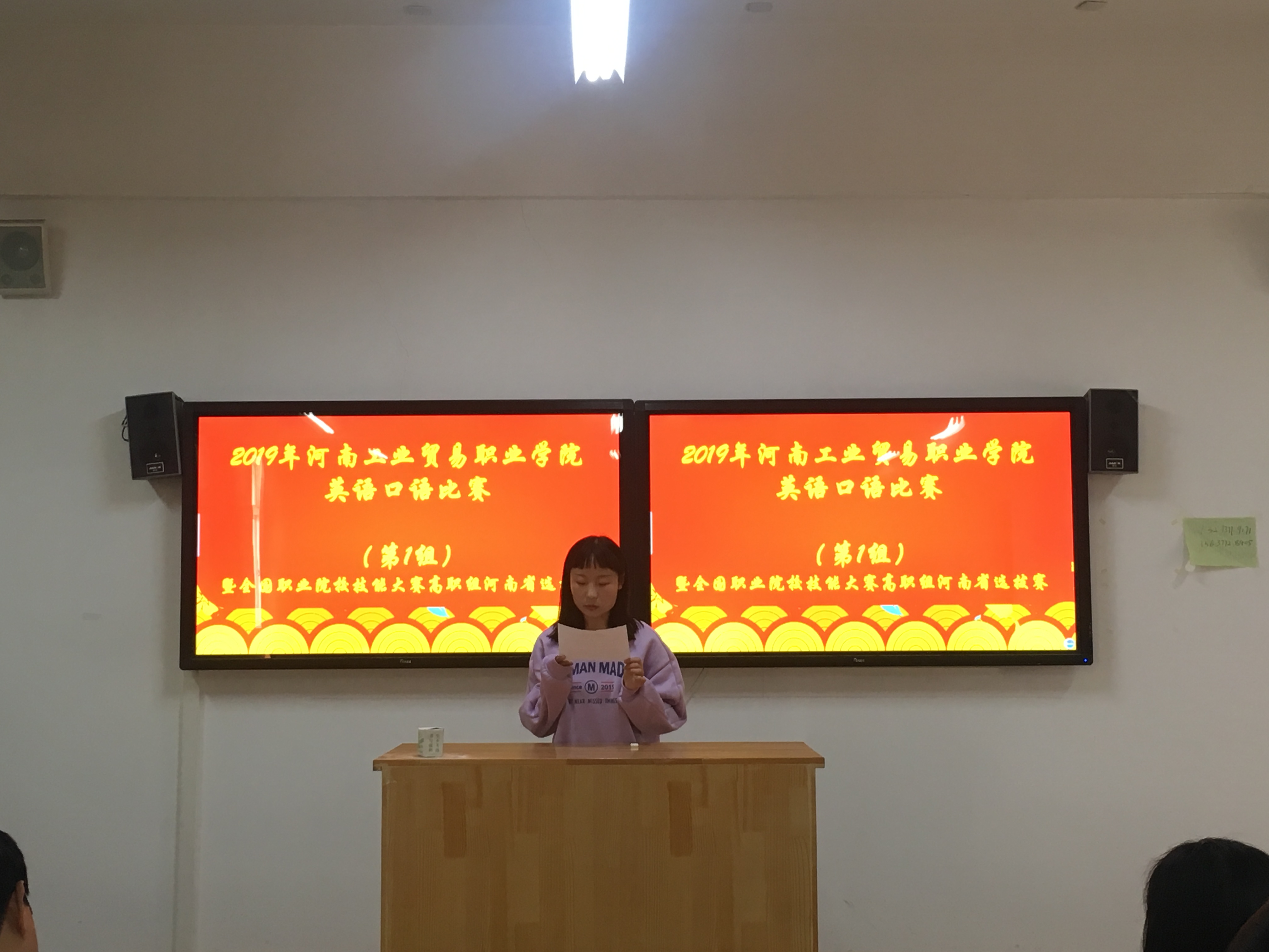 为了培养我院学生学习英语的兴趣,提高英语口语水平,展现学生个人风采,为全国职业院校技能大赛和“讲好河南故事”英语大赛选拔种子选手,应用外语系于2018年10月23日下午14时,在3306、3407和3607教室成功举办了2019年河南工业贸易职业学院英语口语比赛暨全国职业院校技能大赛高职组河南选拔赛及“讲好河南故事”英语大赛选拔赛。