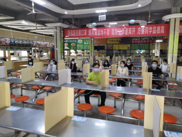 保障安全“放心餐”,进行洗手消毒,接受体温检测,体温正常者依次进入食堂,就餐时单人单桌、同向就坐。