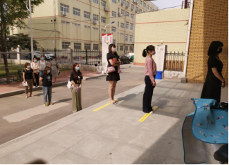 在宿舍门入口处,教师模拟学生保持一定间距,一列纵队有序进入宿舍。严格保持社交距离,并佩戴口罩。
