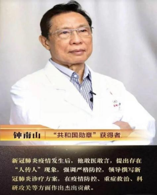 Ø Zhong Nanshan, male, Han nationality, born in 1936 in Nanjing, Fujian province, member of the Communist Party of China, academician of the Chinese Academy of Engineering, director of the National Clinical Research Center for Respiratory Diseases of the First Affiliated Hospital of Guangzhou Medical University, professor of Guangzhou Medical University. In the fight against SARS in 2003, he risked his life to save critically ill patients and rushed to the front line to carry out medical treatment. In 2020, Zhong Nanshan was once again ordered to fight against COVID-19 outbreak. In 2009, he was selected as one of the 100 People who have moved China since the founding of New China. He was awarded the Medal of the Republic in 2020.