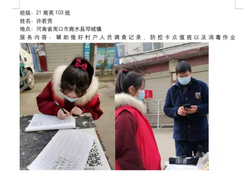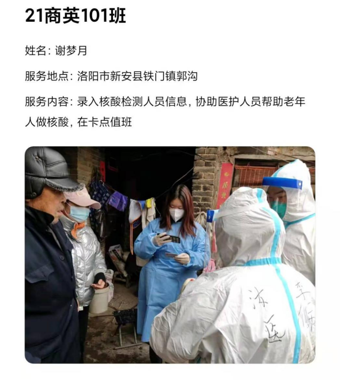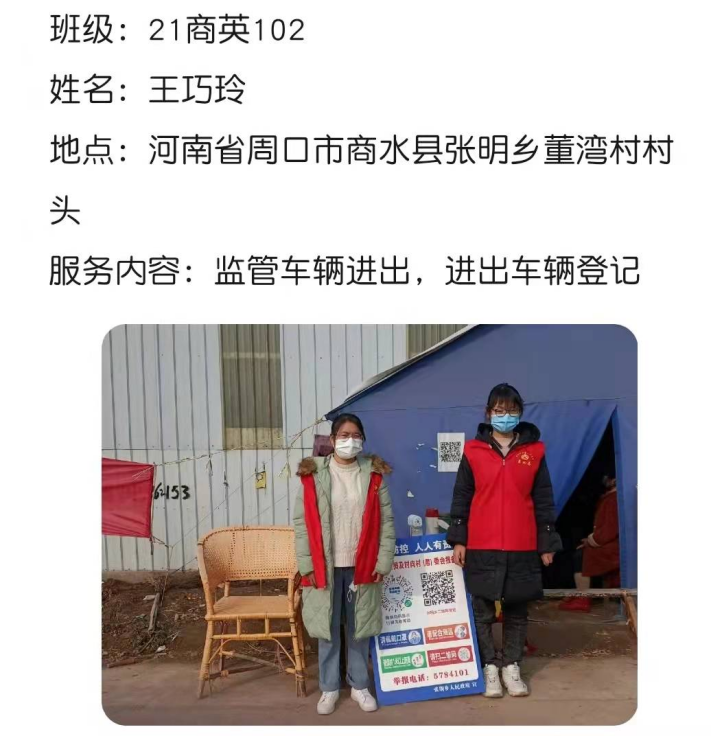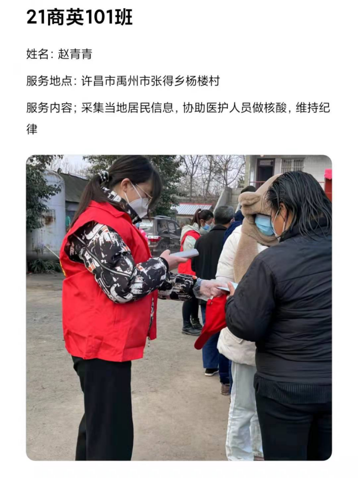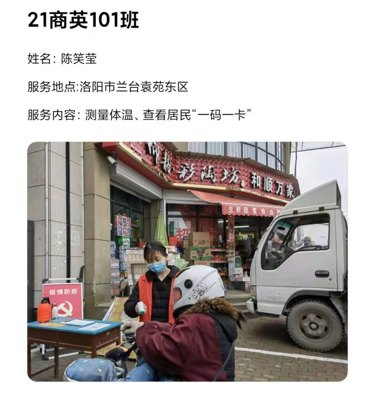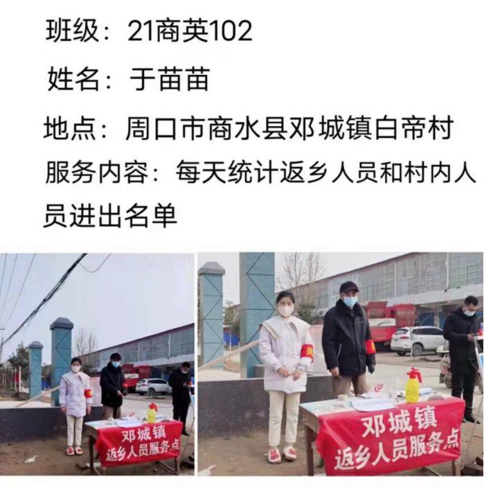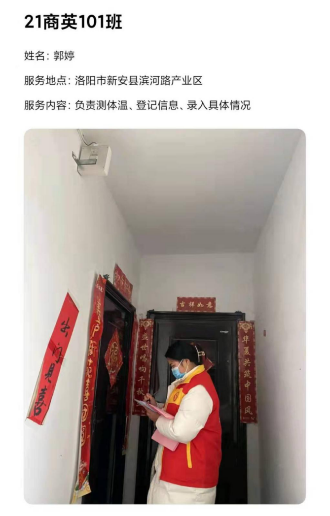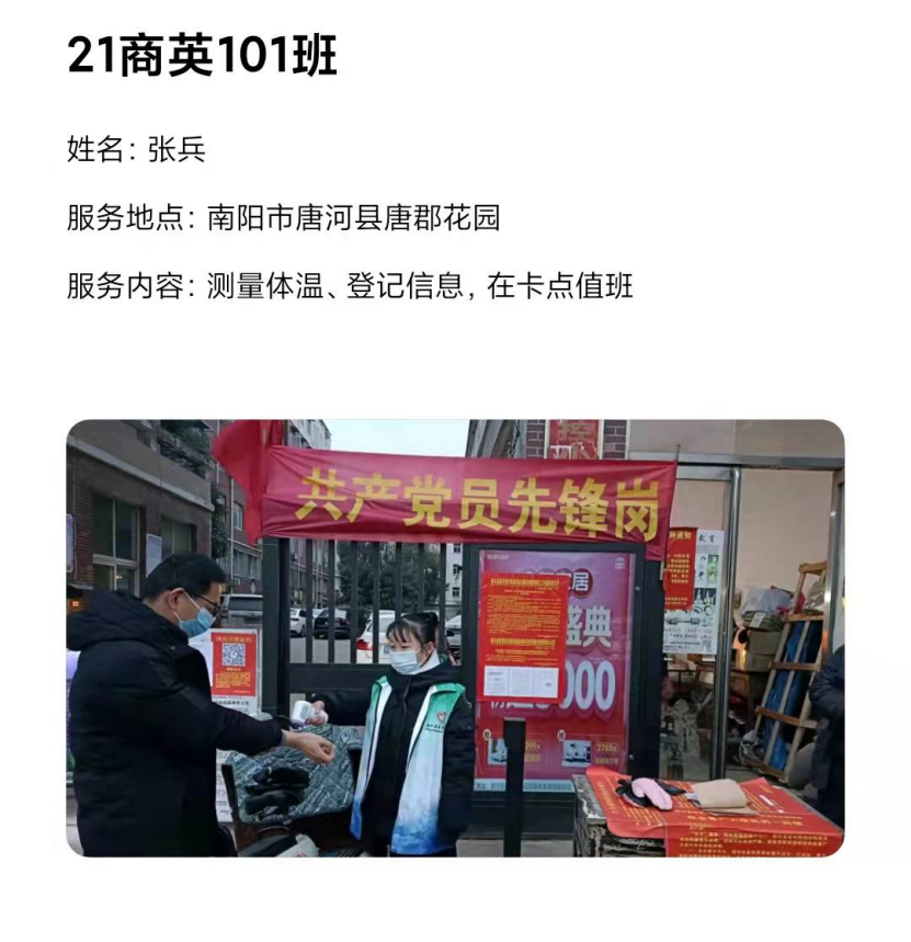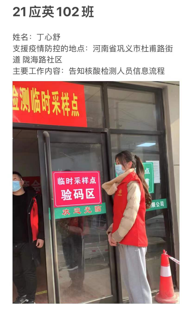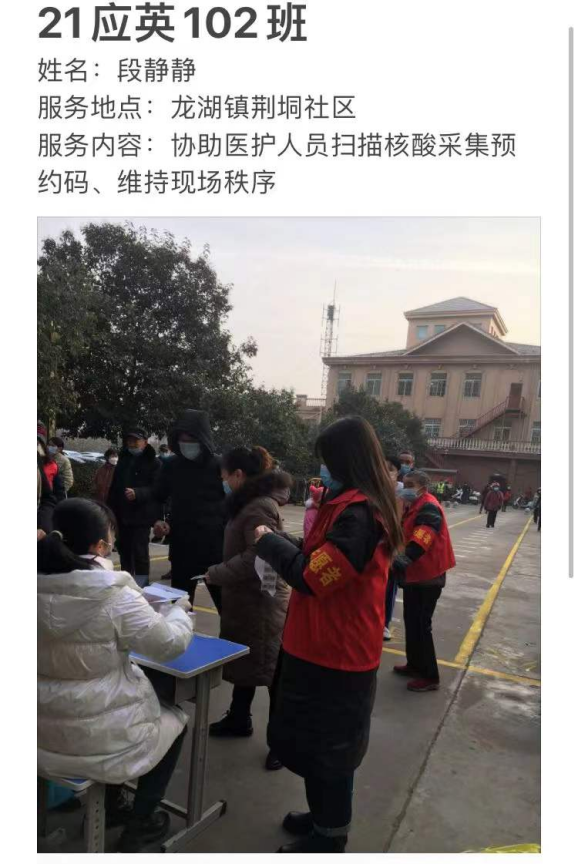 已经放假返回家乡的应用外语学院学子们,积极响应学校党委的号召,毅然加入志愿服务队伍,义无反顾投身家乡的社区疫情防控工作之中,用力所能及的方式为防控战疫出一份力,从核酸检测、体温测量、秩序维护到信息录入、物资搬运....疫情防控的每一条战线,都有我院青年敬业值守、默默奉献的身影。