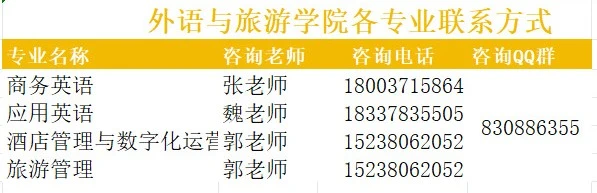 学院现有商务英语、应用英语、酒店管理与数字化运营、旅游管理4个专业,下设3个教研室:应用英语教研室,公共英语教研室,旅游与酒店教研室,除承担本学院的教学及学生管理工作外,同时承担了全校的公共英语教学任务。