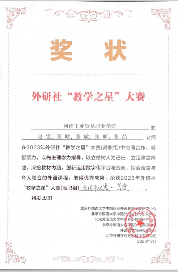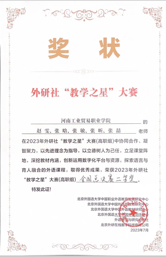 外语与旅游学院教师团队教学创新能力突出,河南省职业教育和继续教育在线开放课程3门:《外贸英语函电》、《跨文化交际》、《茶艺与茶文化》;河南省老年教育课程资源1项:《生活茶艺》;教育部能者为师项目1项:《以茶养生》。同时,我院教师斩获省级以上教学奖项颇丰,如2022年-2024年,获河南省教育教学信息化交流活动一等奖1次,二等奖1次,三等奖2次;2023年获河南省高等职业教育课堂教学创新大赛一等奖、外研社“教学之星”大赛全国总决赛二等奖;2024年获河南省高等职业教育课堂教学创新大赛三等奖、河南省大学生创新大赛职教赛道比赛暨中国国际大学生创新大赛职教赛道河南赛区选拔赛三等奖、河南省高等职业教育技能大赛“研学旅行”省赛一等奖1项、三等奖1项。