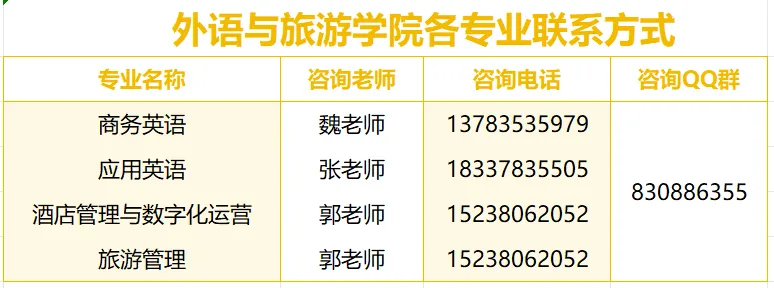 外语与旅游学院师资力量雄厚,同时不断吸纳优秀年轻教师,扩大师资队伍。学院现有教师42人,其中高级职称16人,教授3名,副教授13名,中级职称15人,90%以上为“双师型”教师,其中,教育部职业院校外语类专业教学指导委员会委员1人,省级教学名师2人,省级骨干教师5人,校级教学名师1人,曾陆续有8名来自英美等国的外籍教师来校任教。