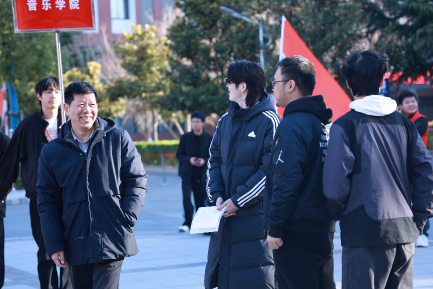 送考现场音乐学院党总支书记李松奇、副院长李晖与考生亲切交谈,鼓励考生沉着冷静,认真答题,细心叮嘱考生带好证件,放松心情,沉着应考。