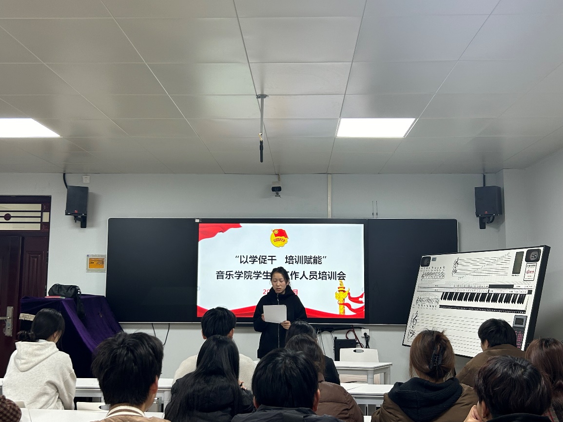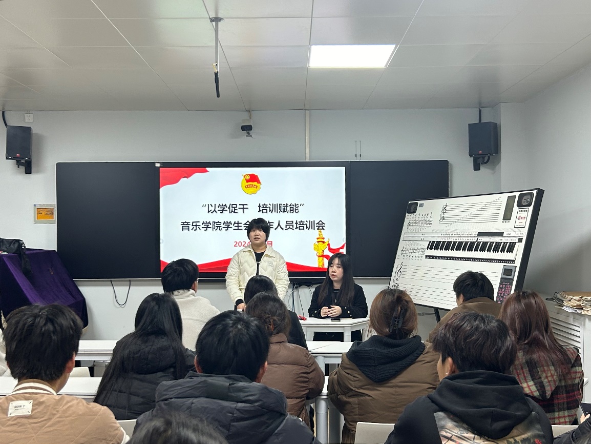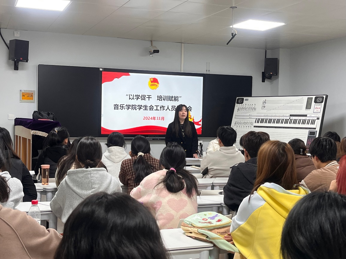 为深入学习贯彻习近平新时代中国特色社会主义思想,认真落实学校有关学生会工作的重点要求,增强学生会的引领力、组织力、服务力。2024年11月6日12点,音乐学院在公共艺术实训中心102教室召开学生干部培训会,学院团总支书记郭琼惠、王晓老师以及学生会全体工作人员参与本次培训。