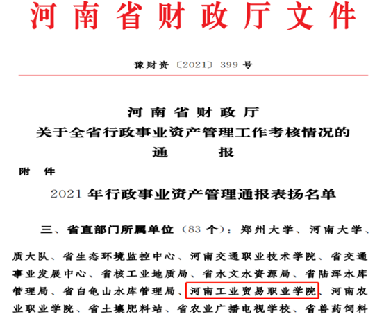 近日,河南省财政厅公布了《关于全省行政事业资产管理工作考核情况的通报》(豫财资〔2021〕399号),对郑州市财政局等18个市县财政局、省政府办公厅等33个省直部门、郑州大学等83个省直部门所属单位给予通报表扬。我校在省直部门所属单位表扬名单之列。