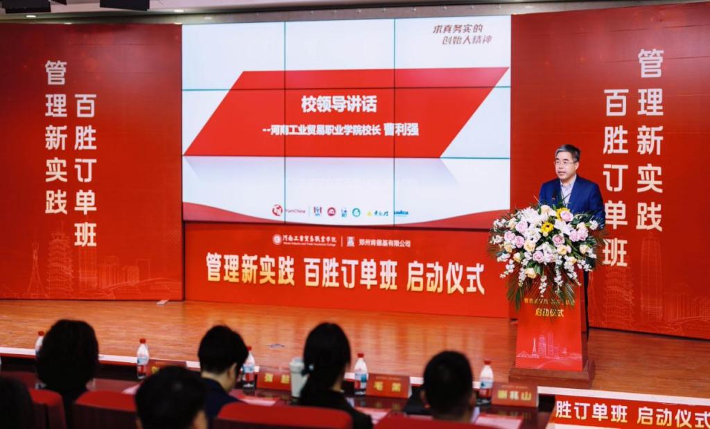 曹利强代表校方致辞。他强调,作为河南省双高校建设单位,我校始终秉持“产教融合、校企合作“的办学理念。此次与郑州肯德基有限公司共建“百胜订单班”的战略合作,既是落实国家“深化产教融合”政策的重要实践,更是对接《国家职业教育改革实施方案》关于“形成校企命运共同体”要求的关键落子。这一合作不仅实现了校企资源深度互通,更通过“企业标准进课程、技术专家驻课堂、岗位认证融教学”等举措,为破解产教协同难题提供可推广经验。未来学校与郑州肯德基有限公司将持续加强深化战略合作,以“招生-培养-就业”一体化闭环机制打造中原餐饮人才供应链标杆,通过动态优化课程体系与双导师联合培养,持续输送数字化复合型人才,为郑州建设国际消费中心城市提供支撑,形成可复制的产教融合示范模式。