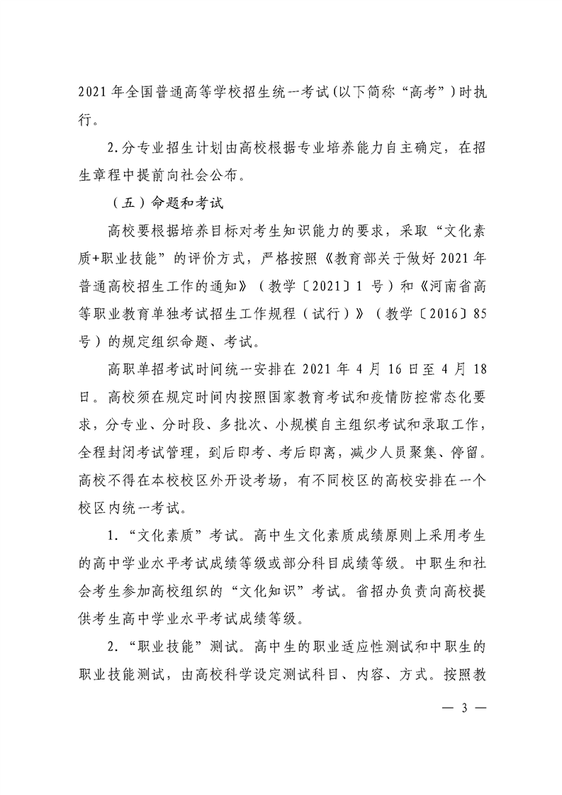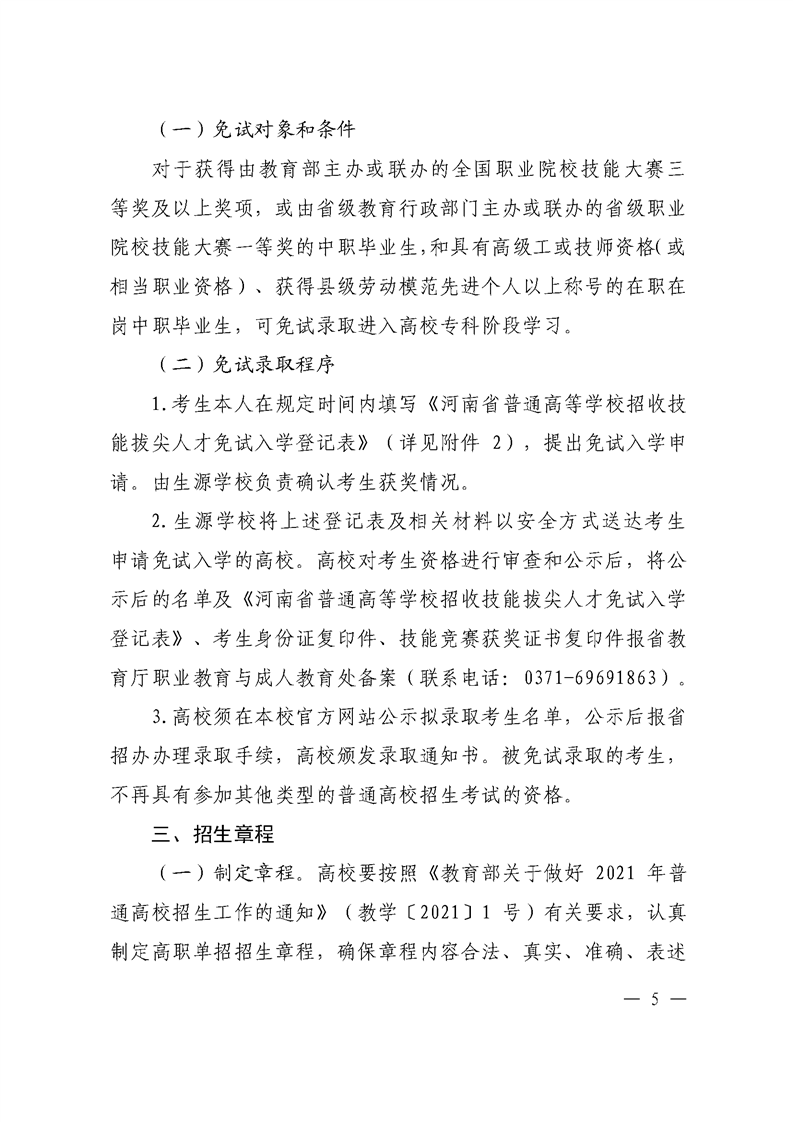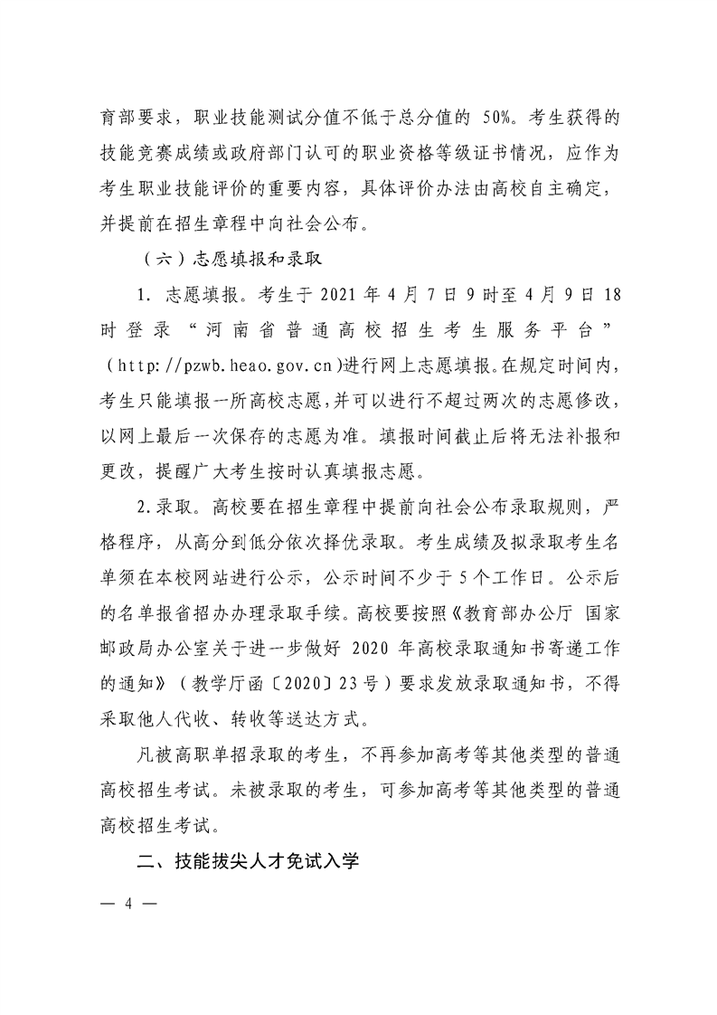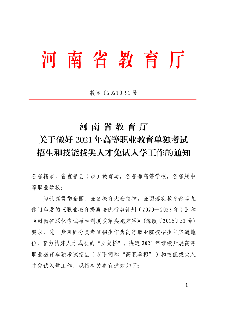 河 南 省 教 育 厅 关于做好 2021 年高等职业教育单独考试 招生和技能拔尖人才免试入学工作的通知