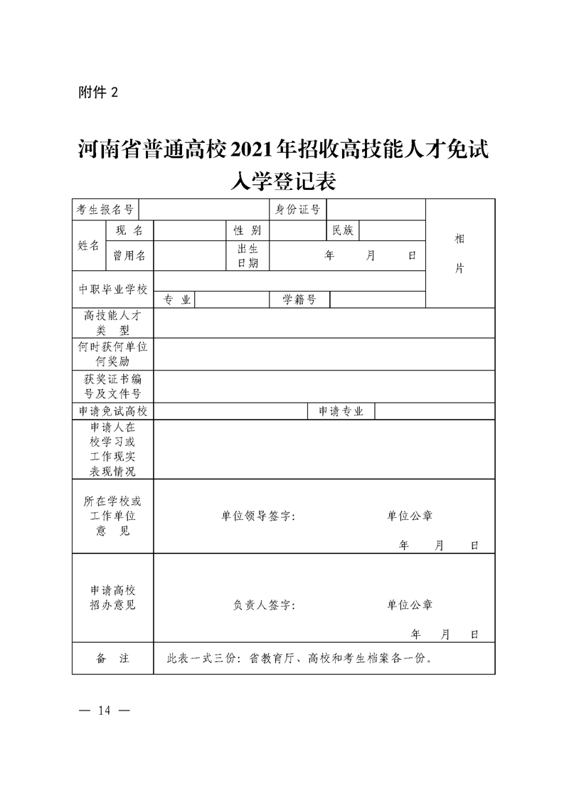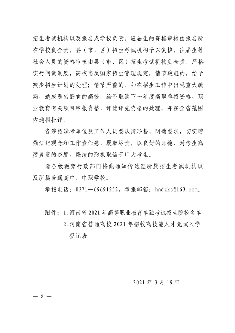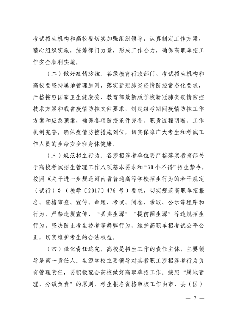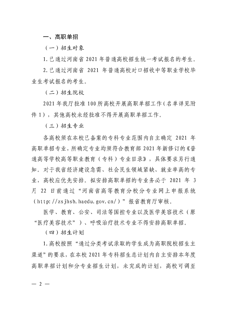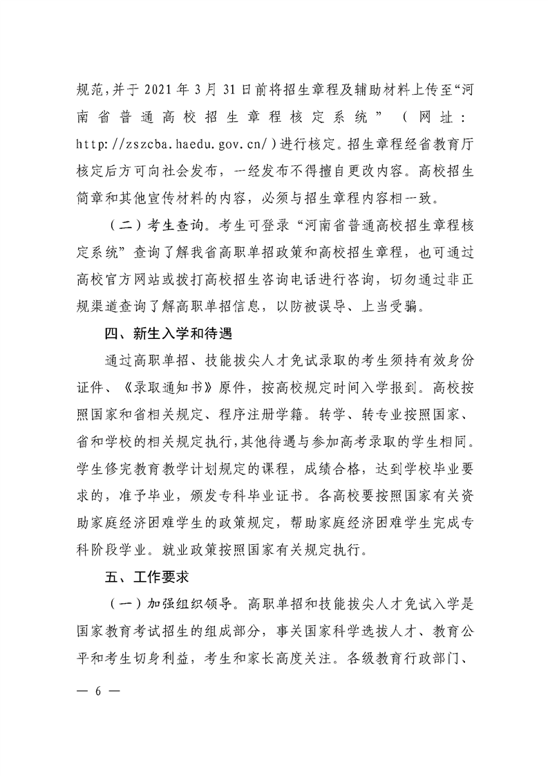 河 南 省 教 育 厅 关于做好 2021 年高等职业教育单独考试 招生和技能拔尖人才免试入学工作的通知