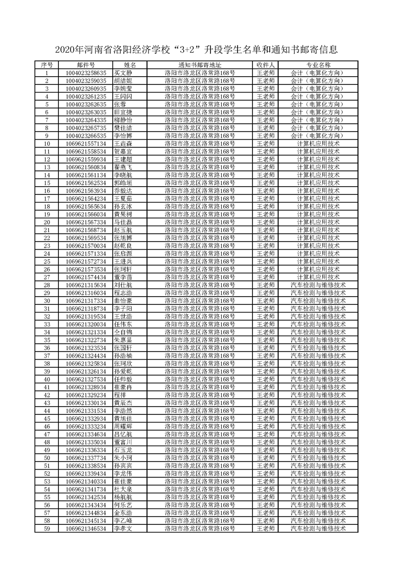 2020年河南省洛阳经济学校“3+2”升段学生名单和通知书邮寄信息