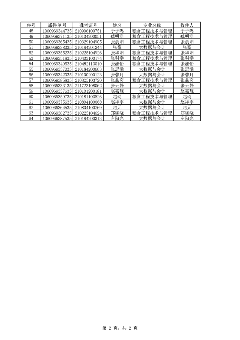 河南工业贸易职业学院2021年五年一贯制专科招生拟录取通知书EMS邮件单号公示(按姓氏排序)