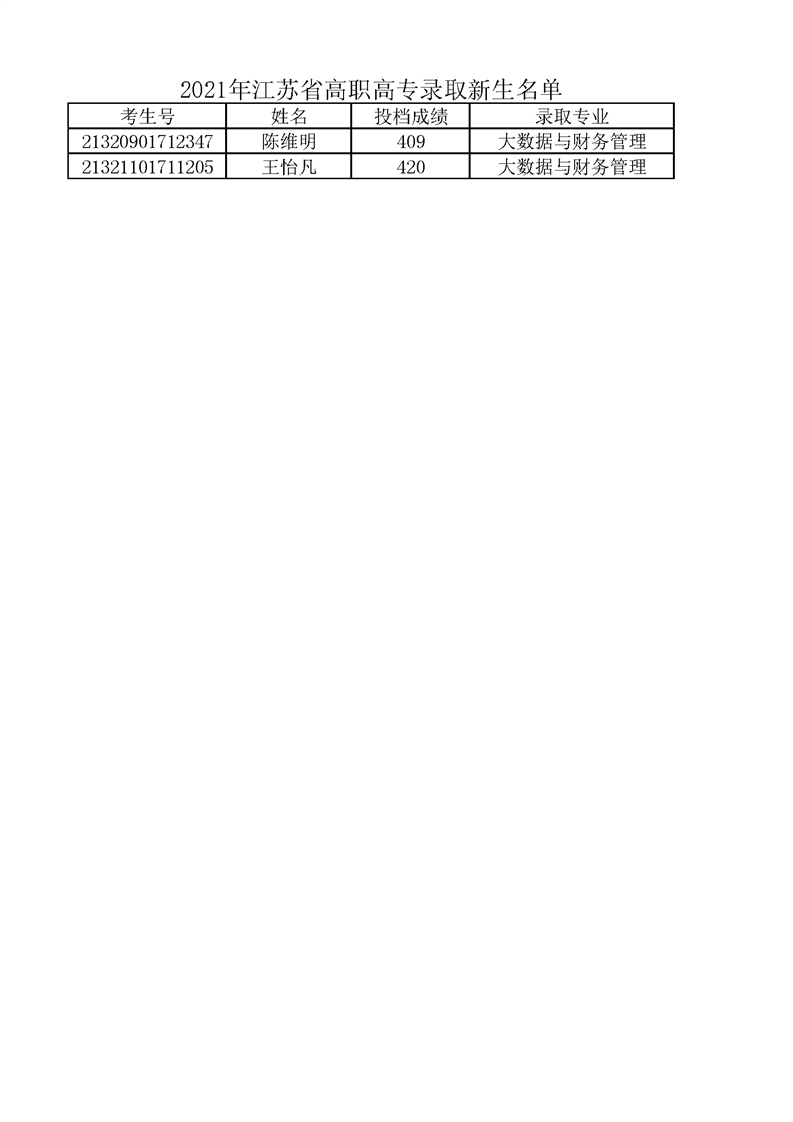 2021年江苏省高职高专录取新生名单