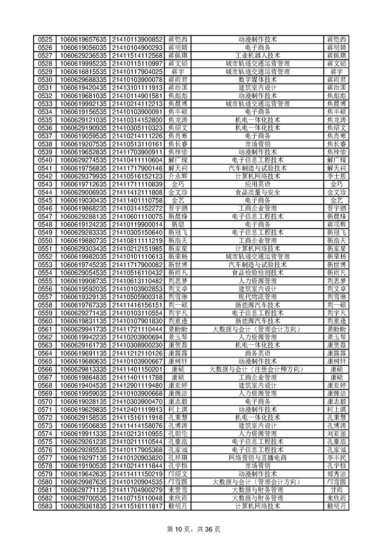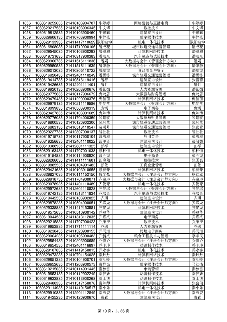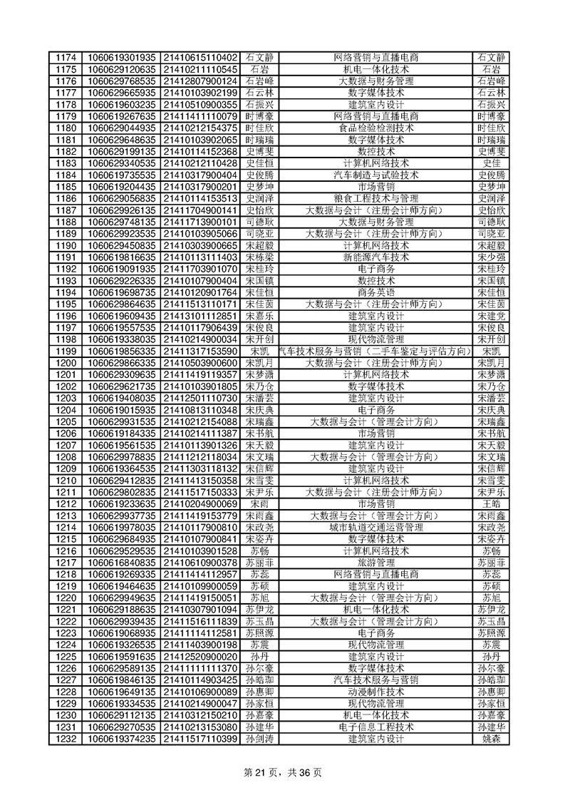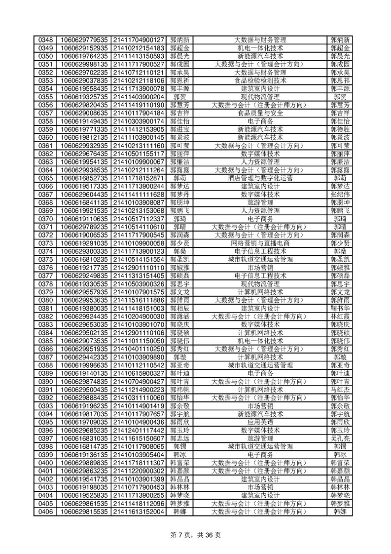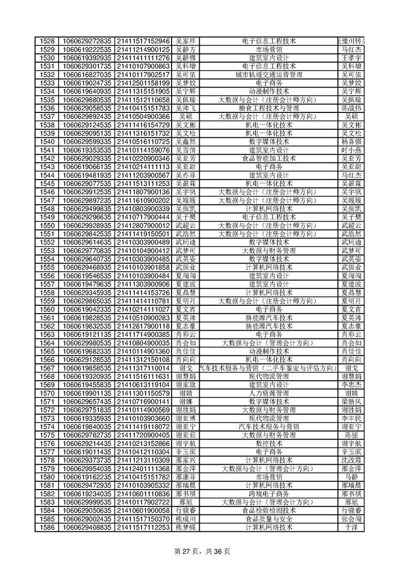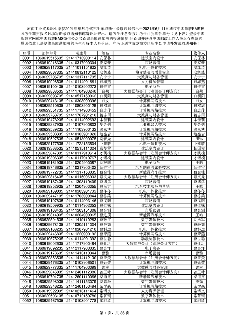 河南工业贸易职业学院2021年单独考试招生录取新生录取通知书EMS邮件单号公示(按姓氏排序)