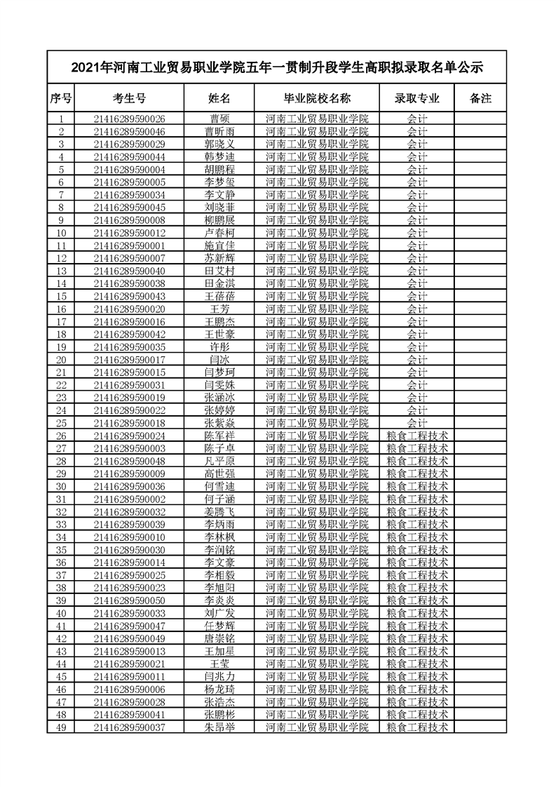 2021年河南工业贸易职业学院五年一贯制升段学生高职拟录取名单公示