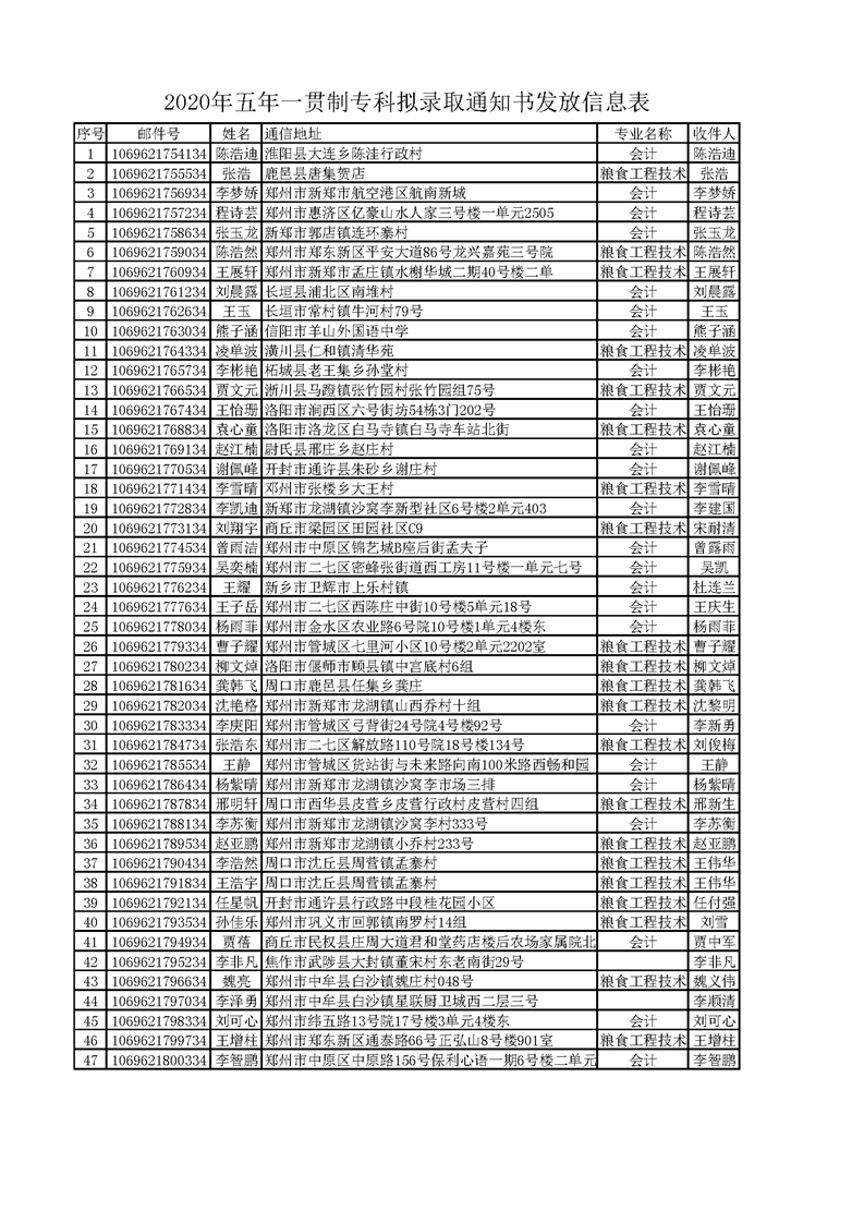 2020年五年一贯制专科拟录取通知书发放信息邮件号表