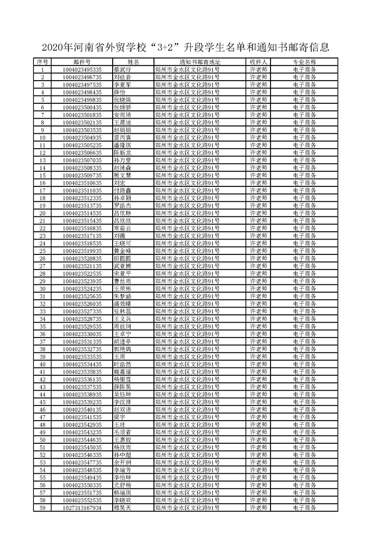 2020年河南省外贸学校“3+2”升段学生名单和通知书邮寄信息