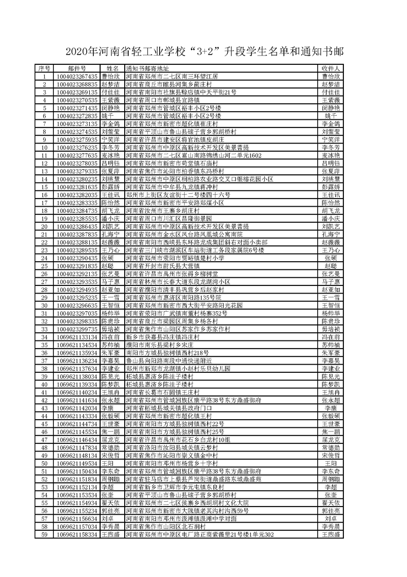 2020年河南省轻工业学校“3+2”升段学生名单和通知书邮寄信息