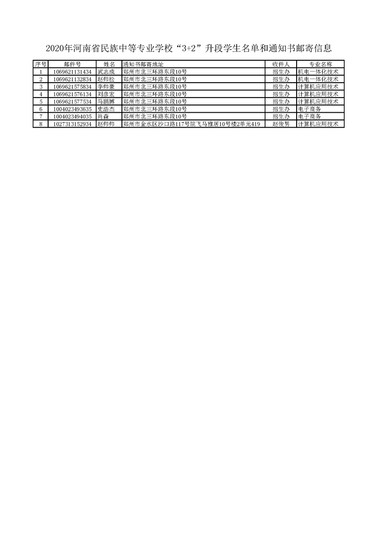 2020年河南省民族中等专业学校“3+2”升段学生名单和通知书邮寄信息
