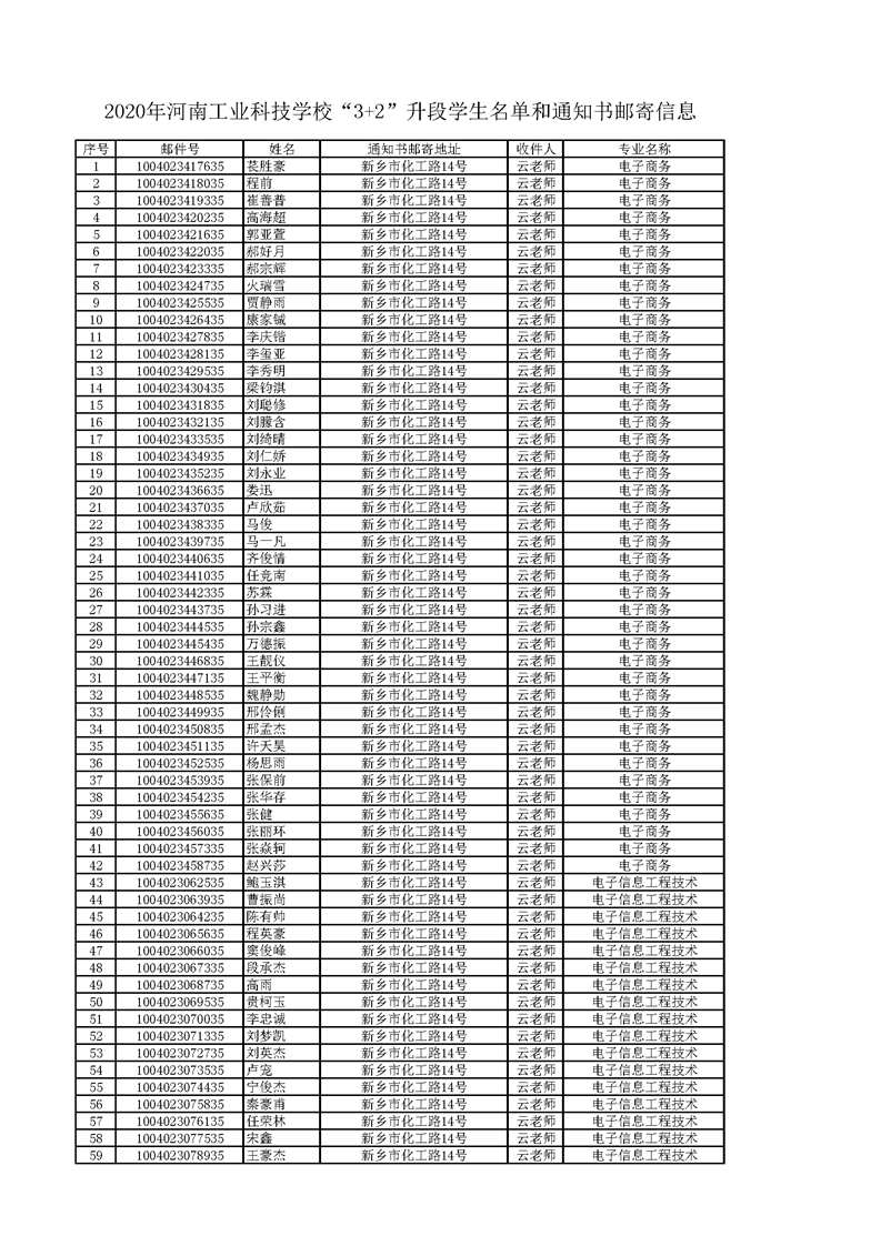 2020年河南工业科技学校“3+2”升段学生名单和通知书邮寄信息