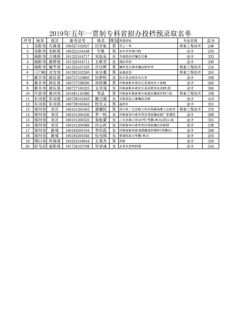 2019年五年一贯制专科省招办投档预录取名单