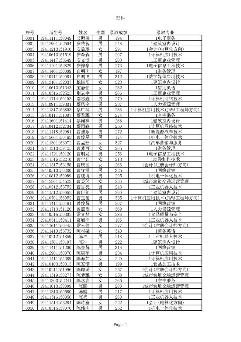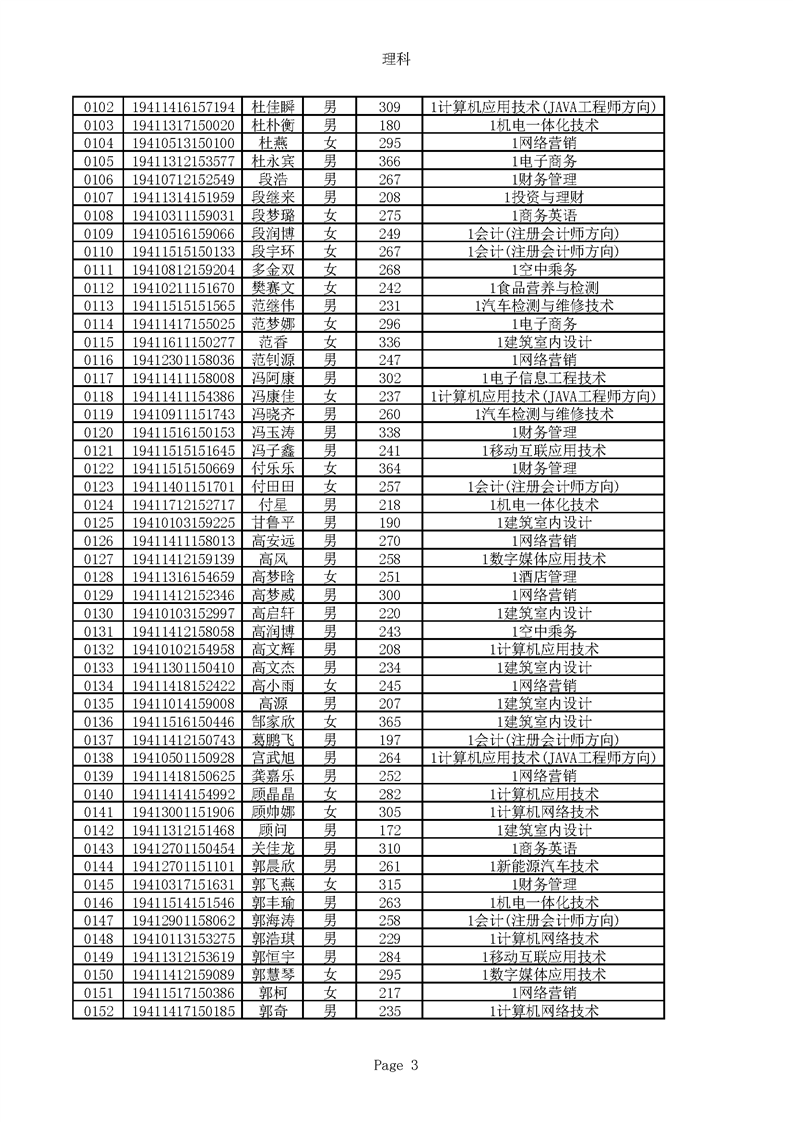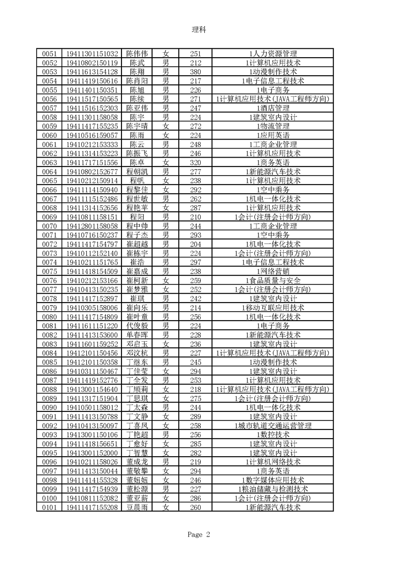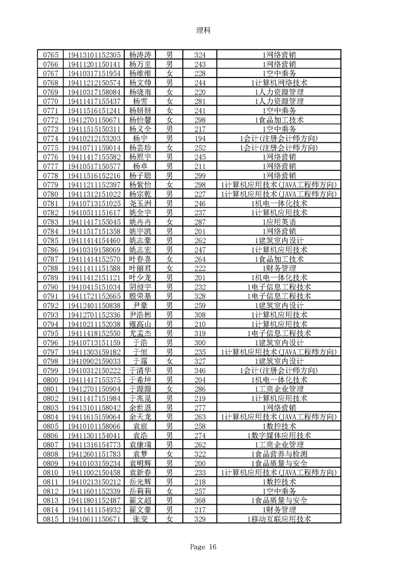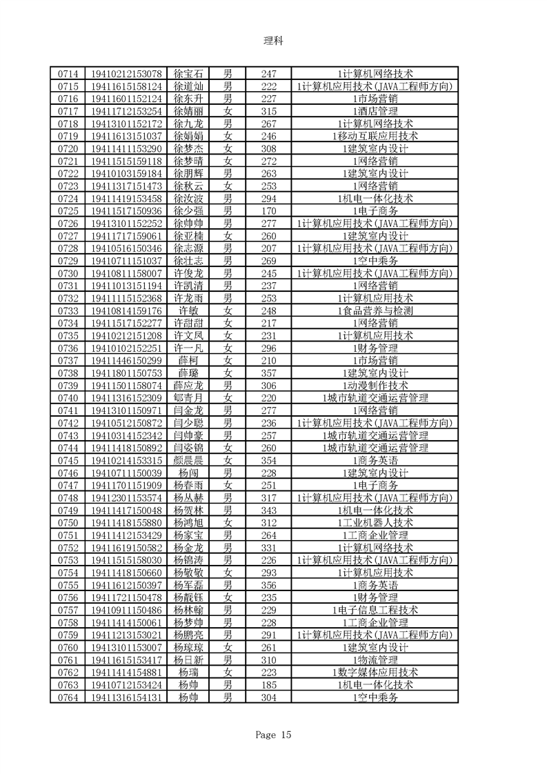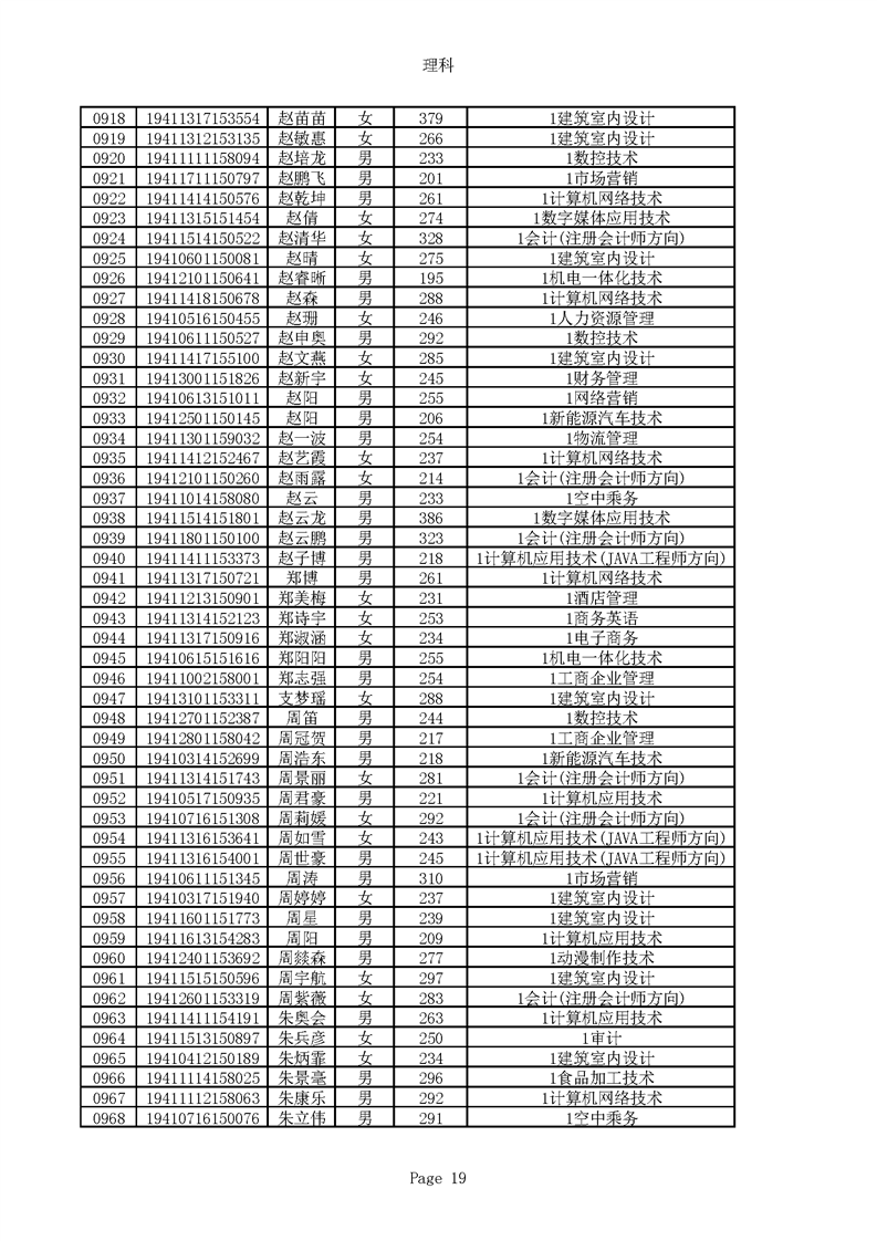 2019年河南高职高专理科平行志愿录取新生名单(按姓氏排序)