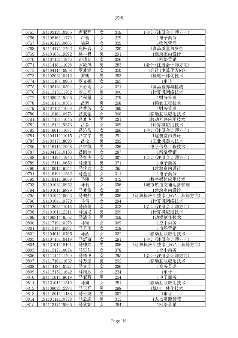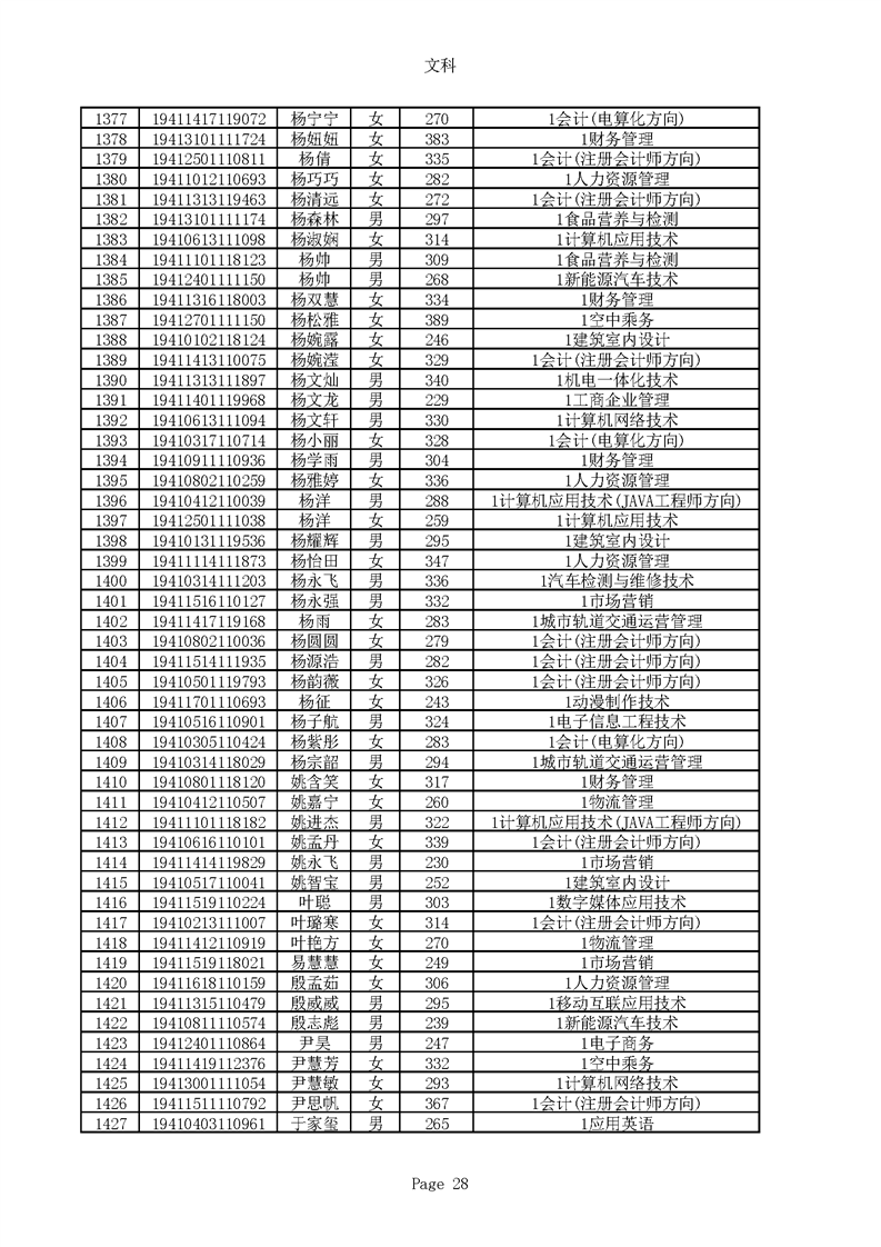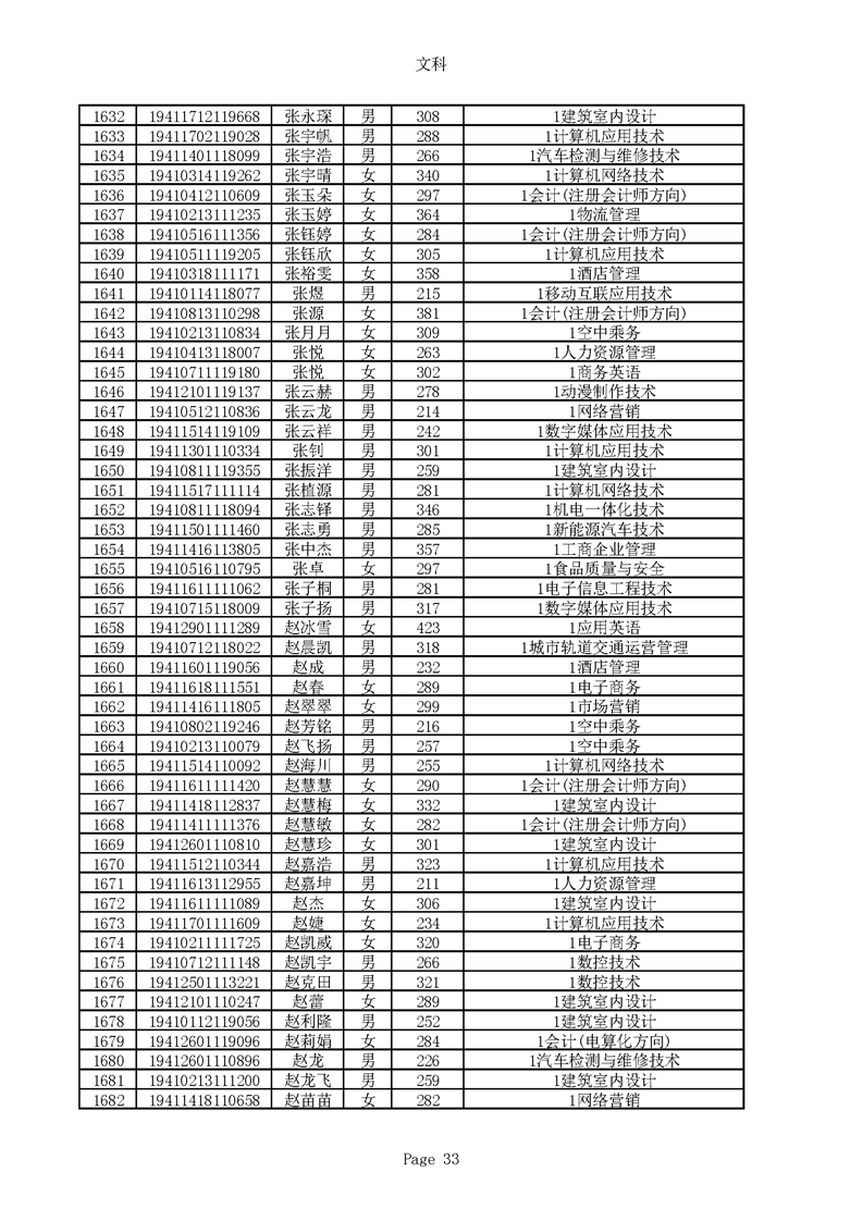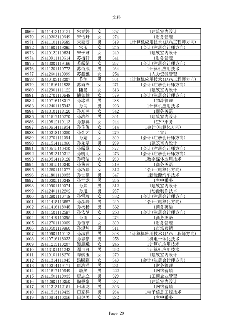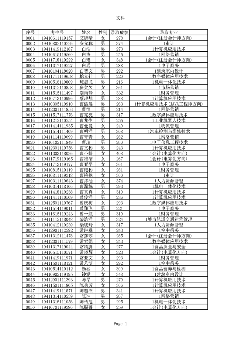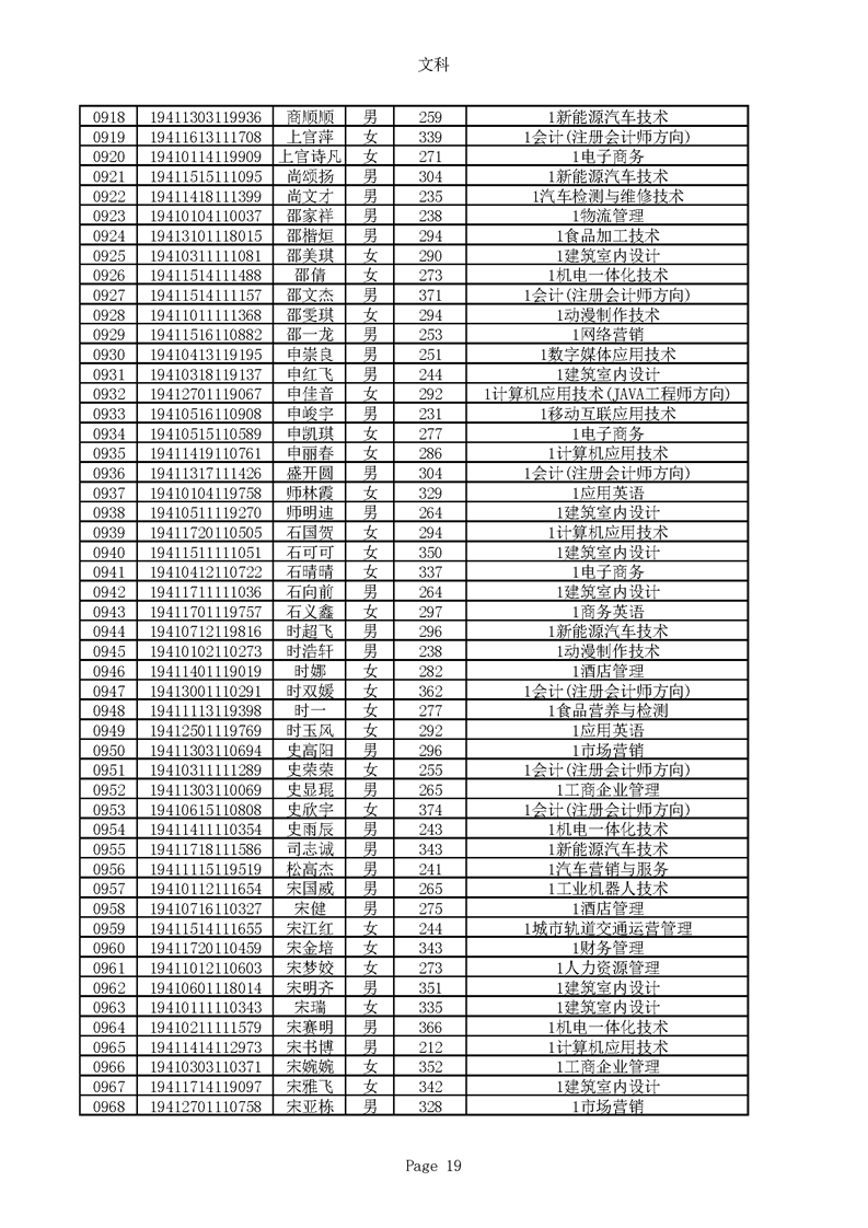 2019年河南高职高专文科平行志愿录取新生名单(按姓氏排序)