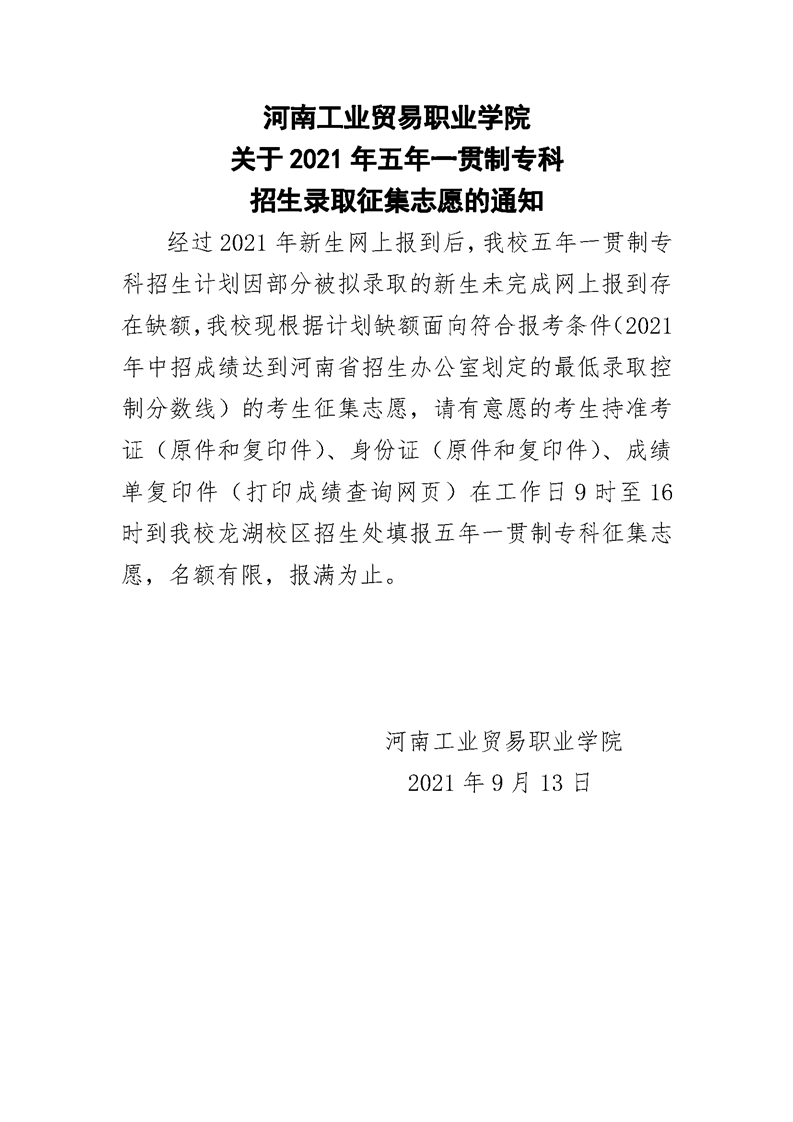 河南工业贸易职业学院关于 2021 年五年一贯制专科招生录取征集志愿的通知