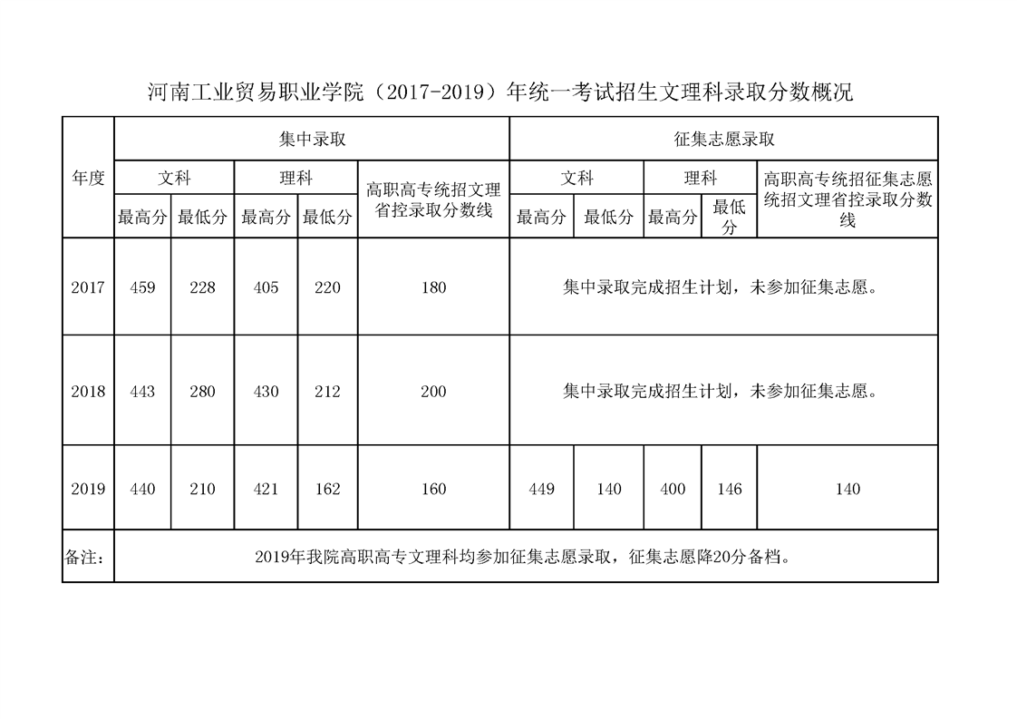 河南工业贸易职业学院(2017-2019)年统一考试招生文理科录取分数概况