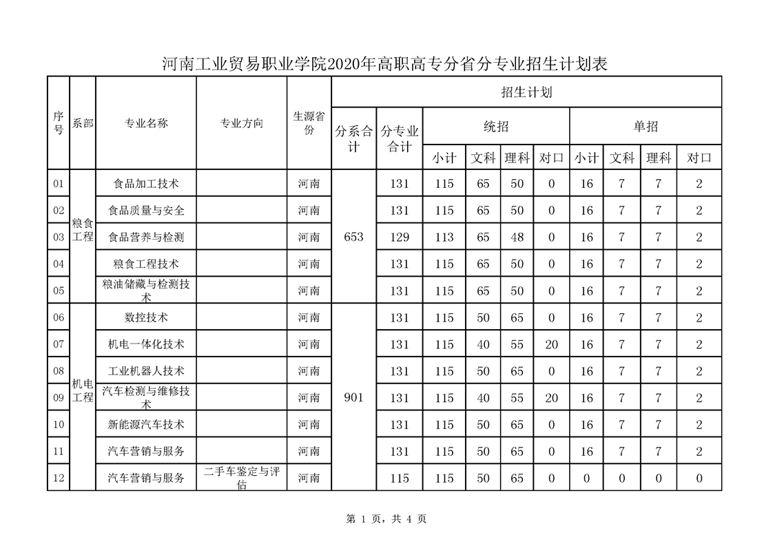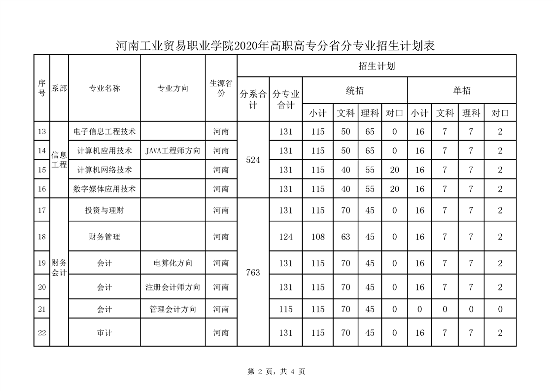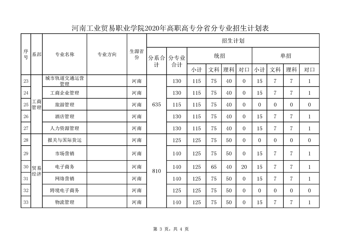 河南工业贸易职业学院2020年高职高专分省分专业招生计划表