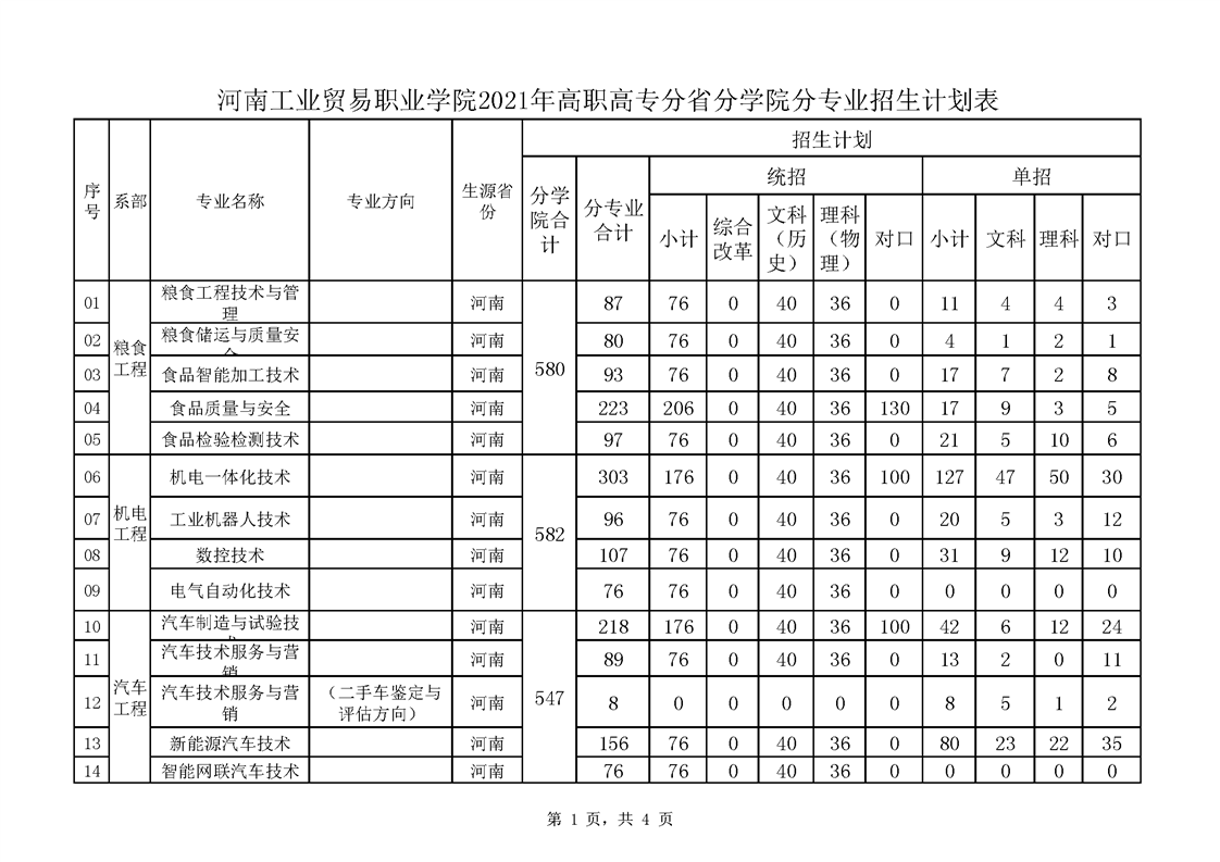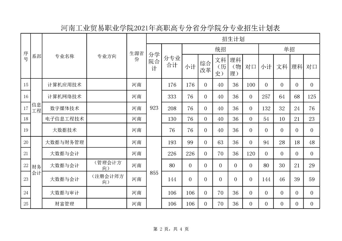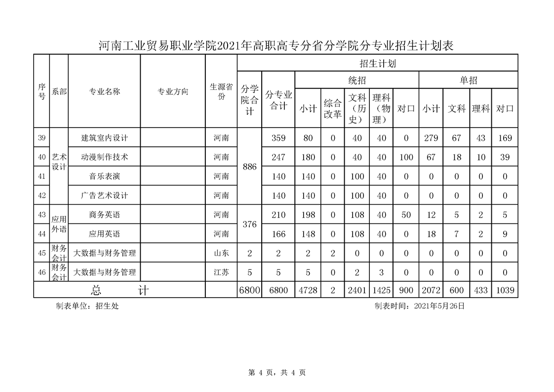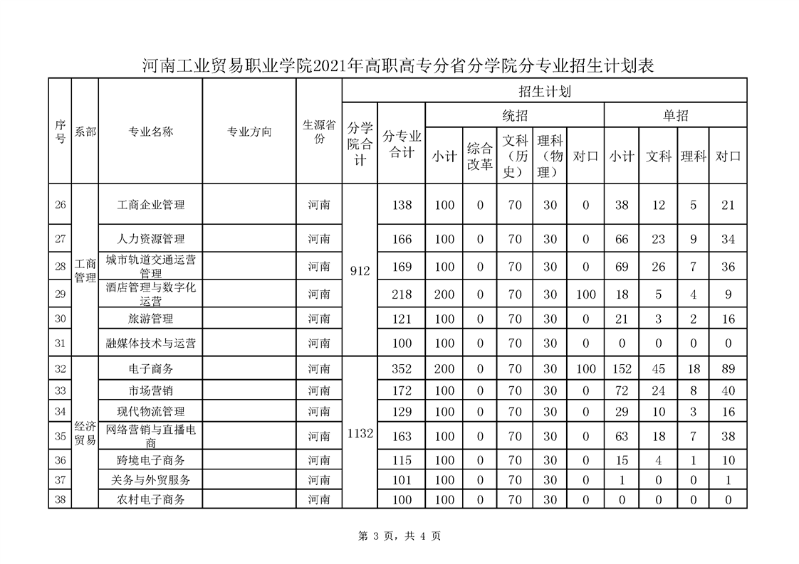 河南工业贸易职业学院2021年普通专科招生计划汇总表