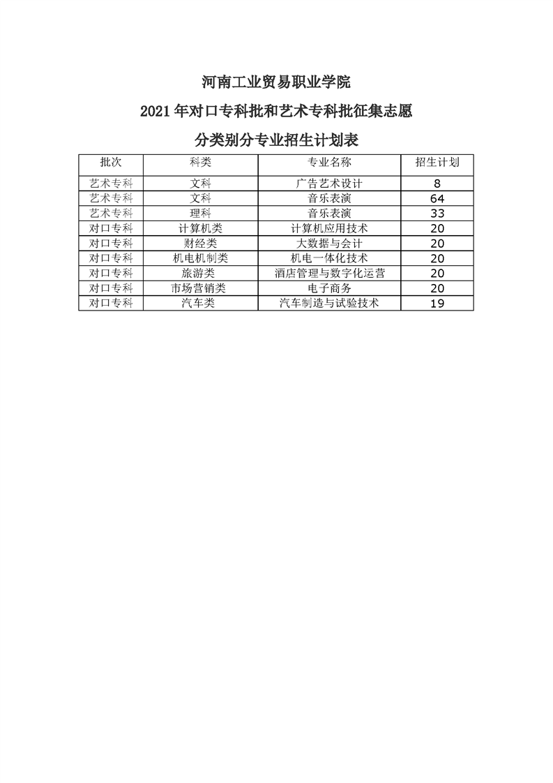 河南工业贸易职业学院 2021年对口专科批和艺术专科批征集志愿 分类别分专业招生计划表