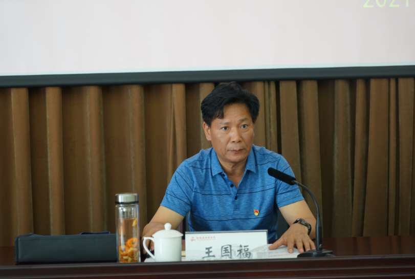 王国福宣读《中共河南工业贸易职业学院委员会关于举办2021年副科级以上干部党史学习教育培训班的通知》,明确了培训主题和形式,强调了“提高认识”“注重实效”“严格纪律”的培训要求。
